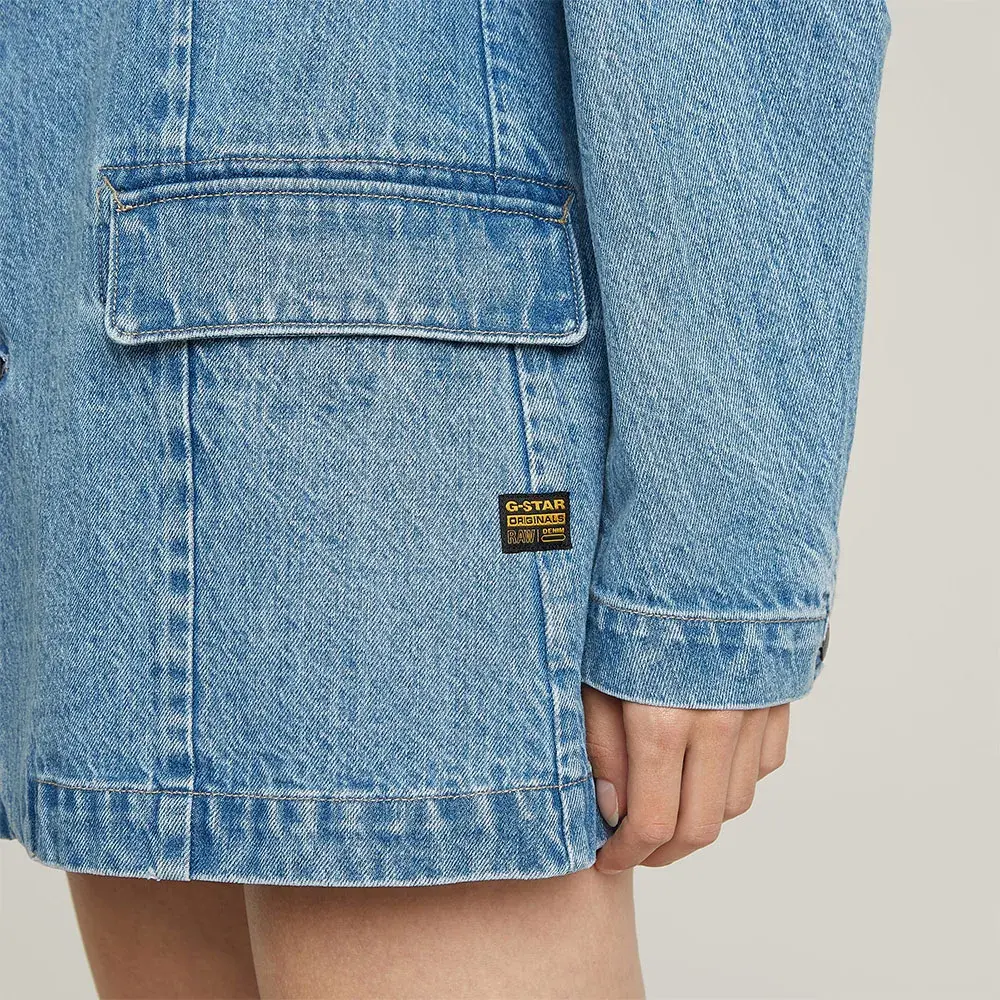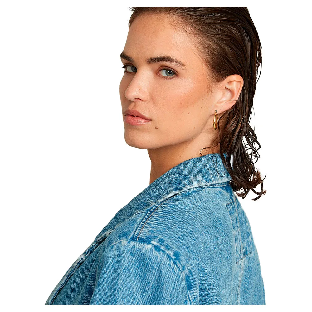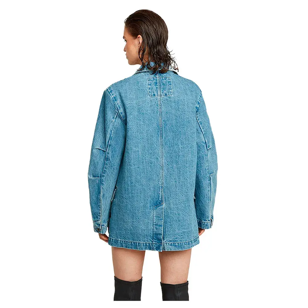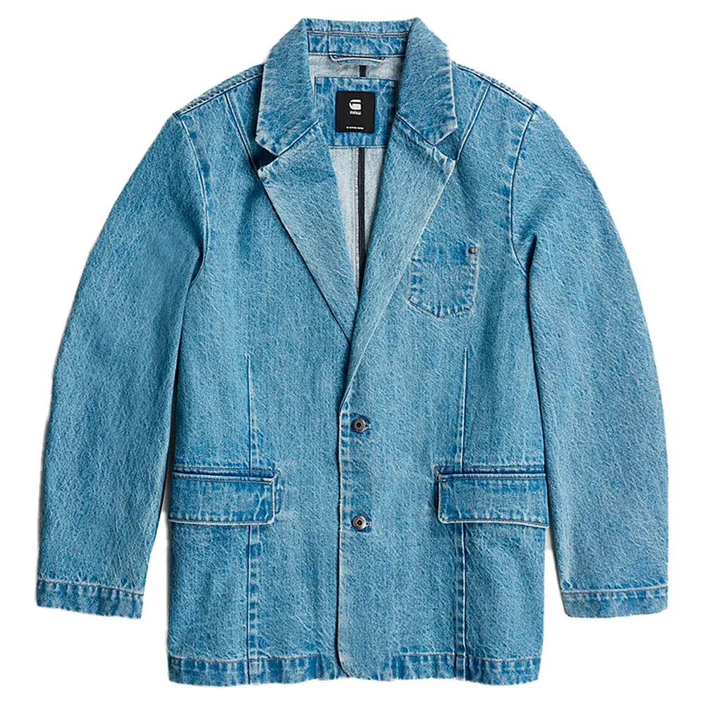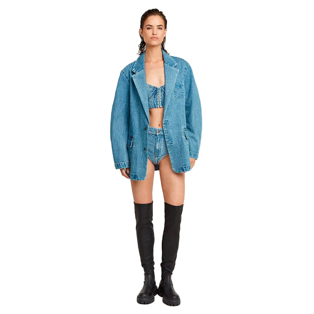 Джинсовый пиджак Oversize застегивается на две пуговицы и имеет разрез сзади.