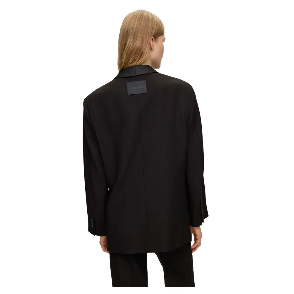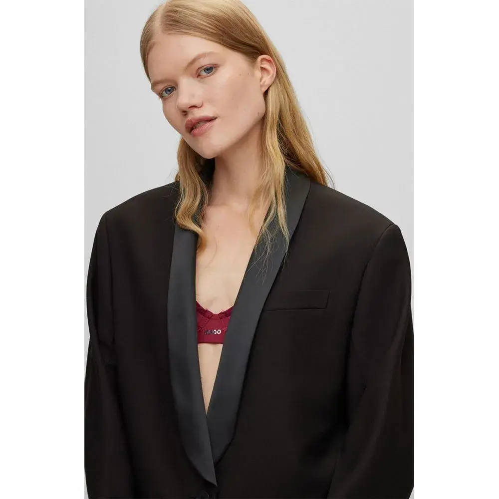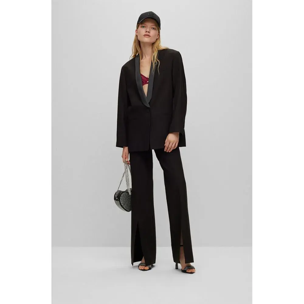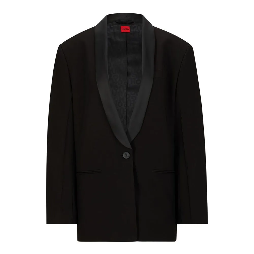 Пиджак свободного кроя с одной пуговицей, широкими плечами, фирменной подкладкой и шалевыми лацканами от HUGO Womenswear — идеальный вариант для любого случая. Изделие изготовлено из целлюлозных волокон, полученных из натурального древесного сырья, поставляемого из контролируемых лесов.