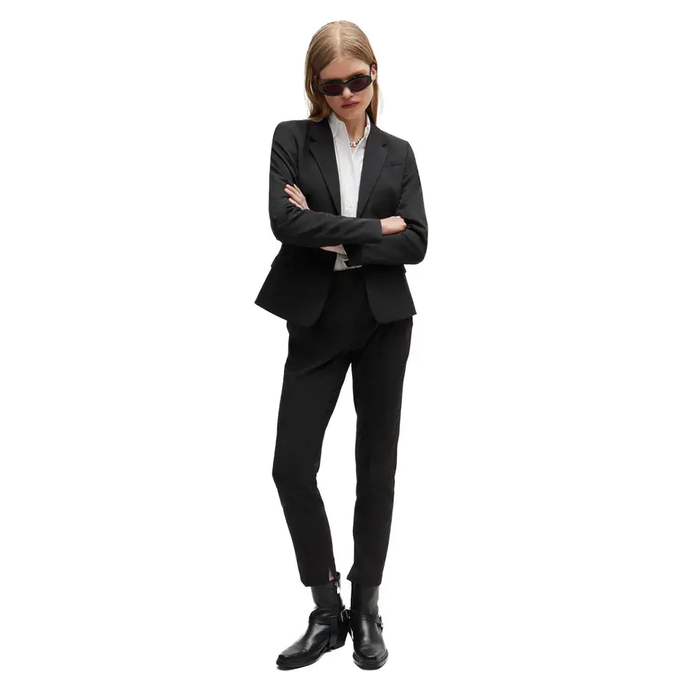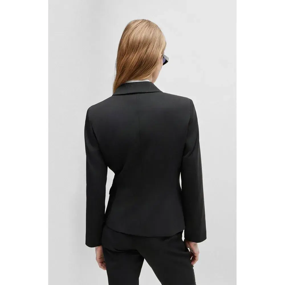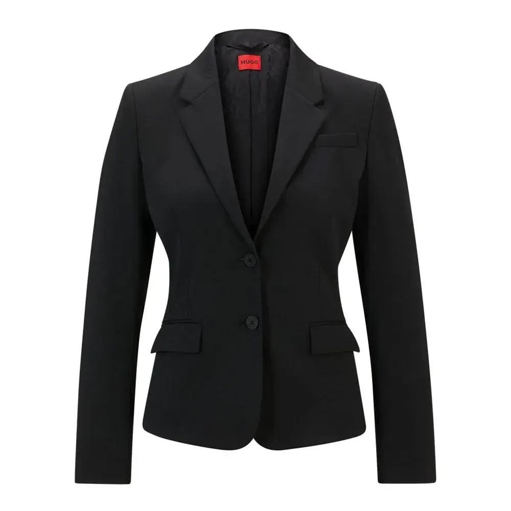 Однобортный пиджак от HUGO Womenswear. Этот современный дизайн, выполненный из смеси натуральной шерсти и эластичного материала, отличается отложным воротником, карманами с клапанами и фирменной подкладкой.