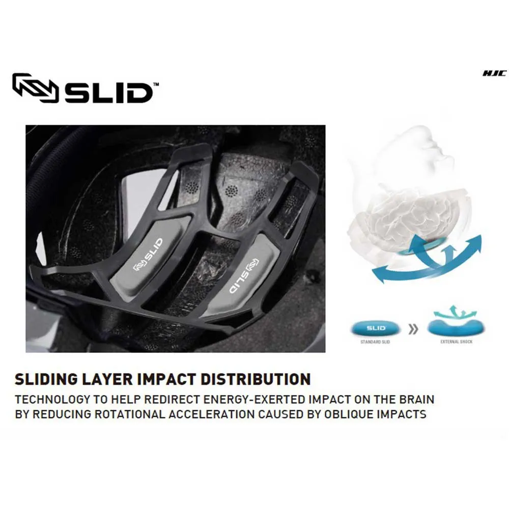 - SLID️ является вершиной технологий безопасности в велосипедных шлемах, инновационной функцией, созданной HJC, которая включает в себя специальный материал GEL внутри подкладки шлема. Эта технология была разработана для уменьшения количества энергии, передаваемой в мозг в случае удара, обеспечивая вращательную функцию, которая минимизирует энергию вращательного удара на мозг.