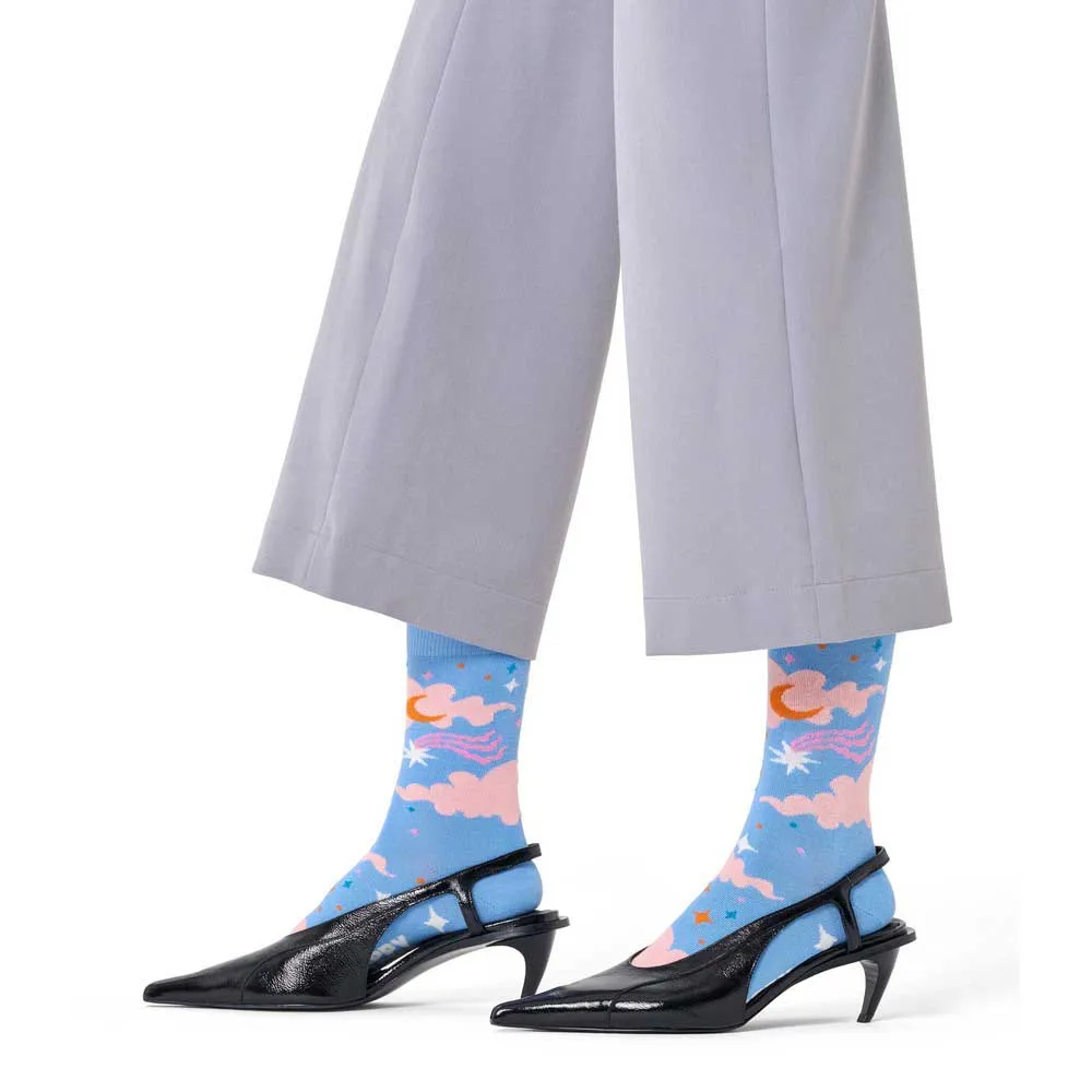 Дотянитесь до звезд с нашими носками Starry Sky Sock, украшенными причудливым рисунком светло-голубого ночного неба с пушистыми белыми облаками и мерцающими звездами.