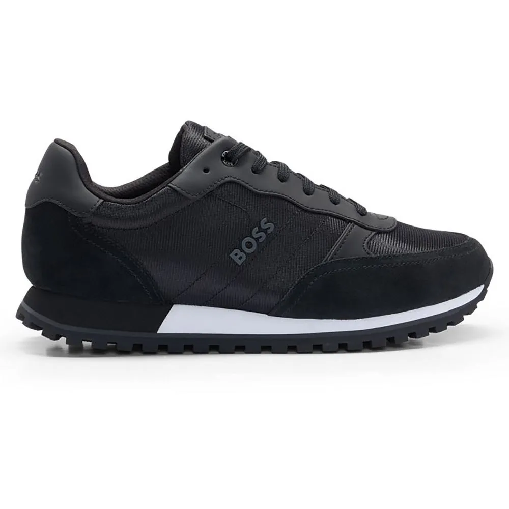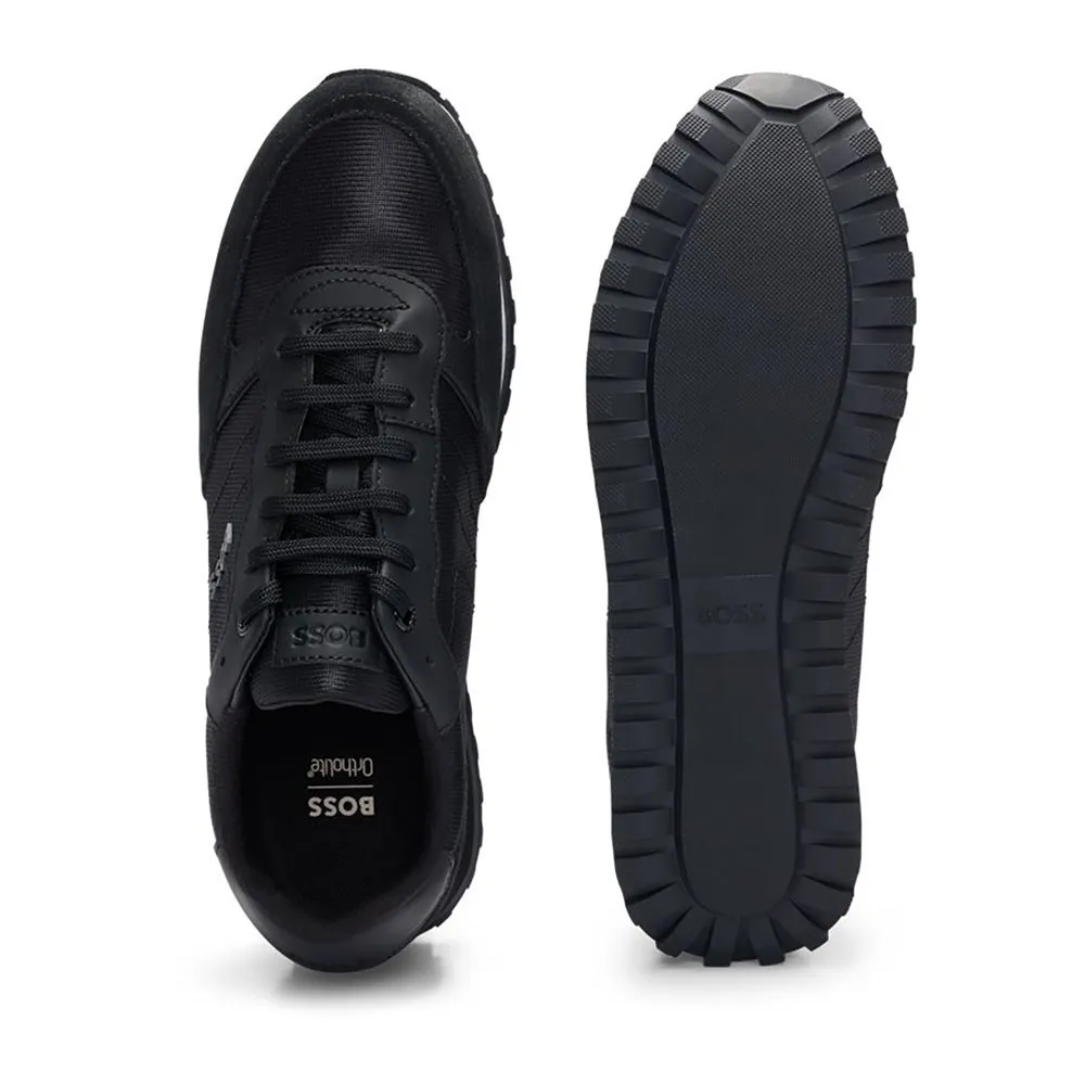 Гибридные кроссовки от Boss, разработанные в беговом стиле из смешанных материалов с подошвой из резины EVA и логотипами на язычке и боковой панели.