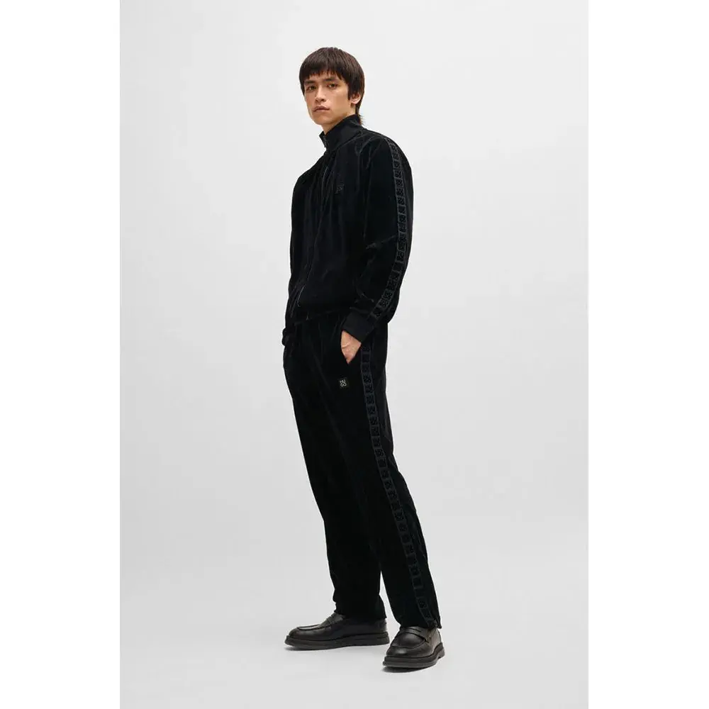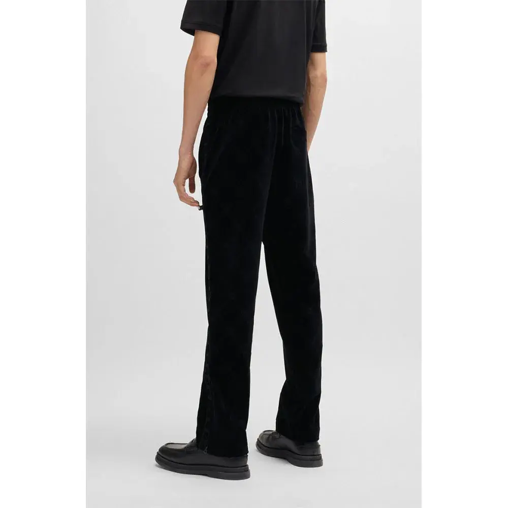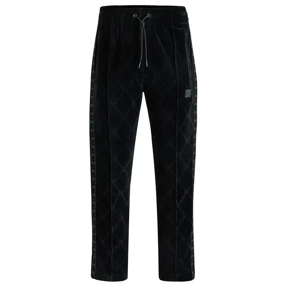 Спортивные брюки свободного кроя с застежкой-молнией от HUGO. Изготовлены из эластичного бархата с фирменным узором в виде цепочек и украшены лентой с логотипом.