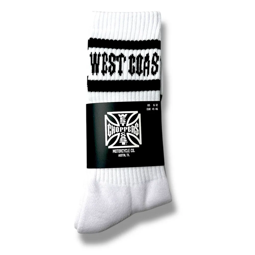 Пара белых носков с чоппером West Coast по всей длине и крестообразным логотипом в верхней части стопы.