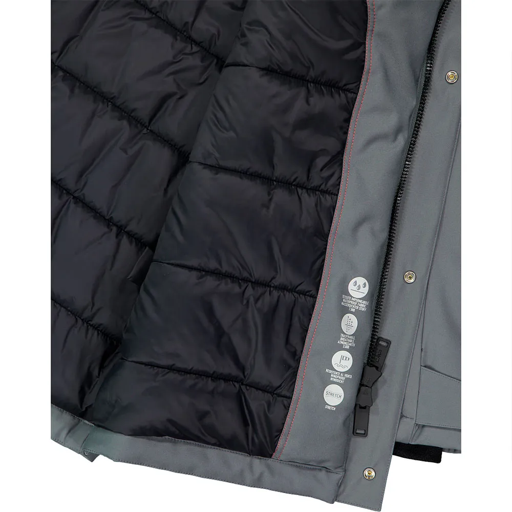Одежду дополняют съемный капюшон, два боковых кармана и один нагрудный карман на молнии, регулируемые манжеты, передняя застежка-молния с ветрозащитным клапаном.