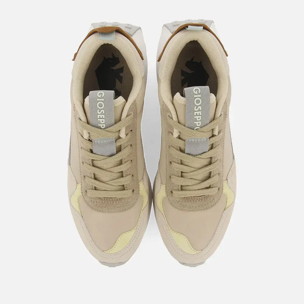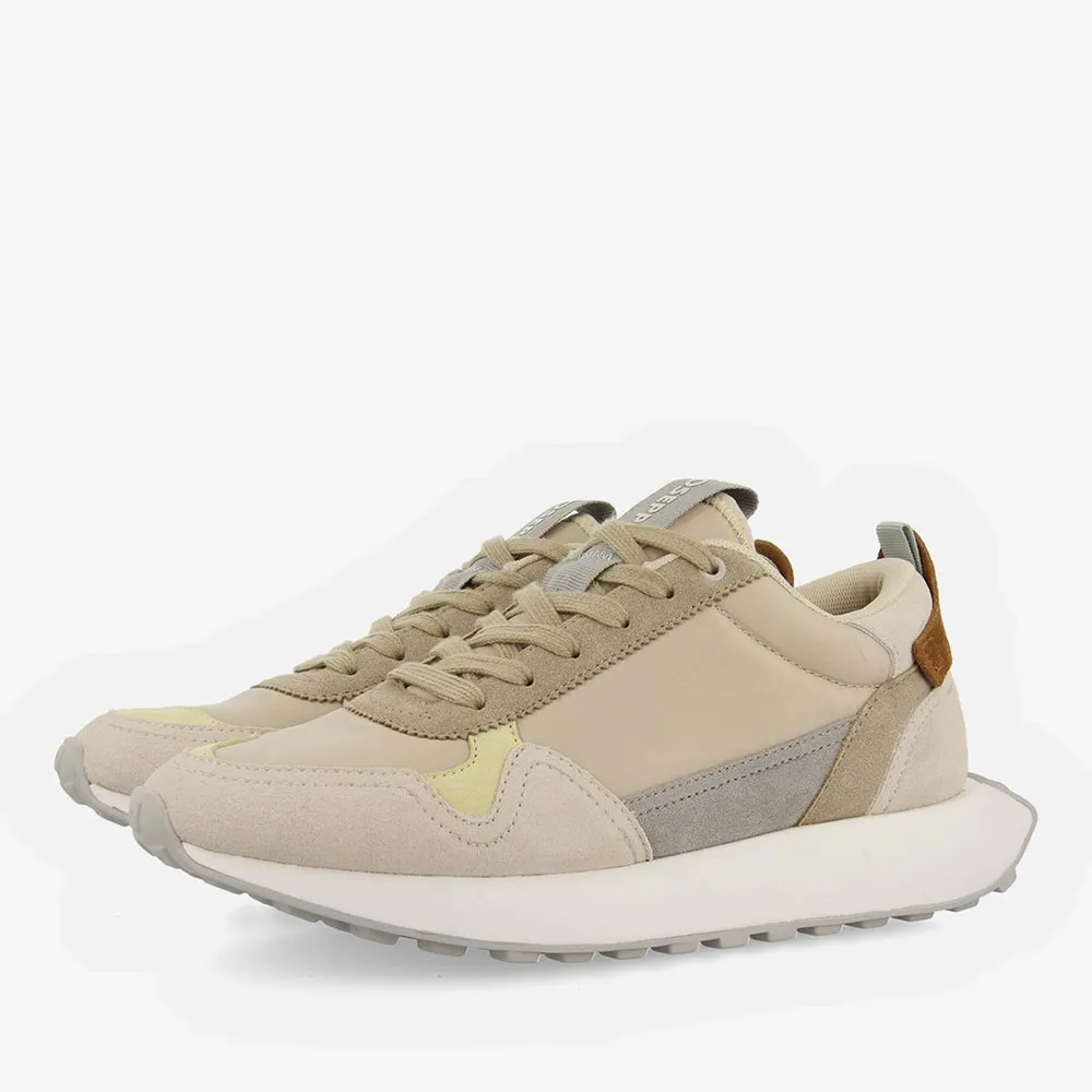 Бежевые кроссовки контрастных цветов из спилка и технической ткани.