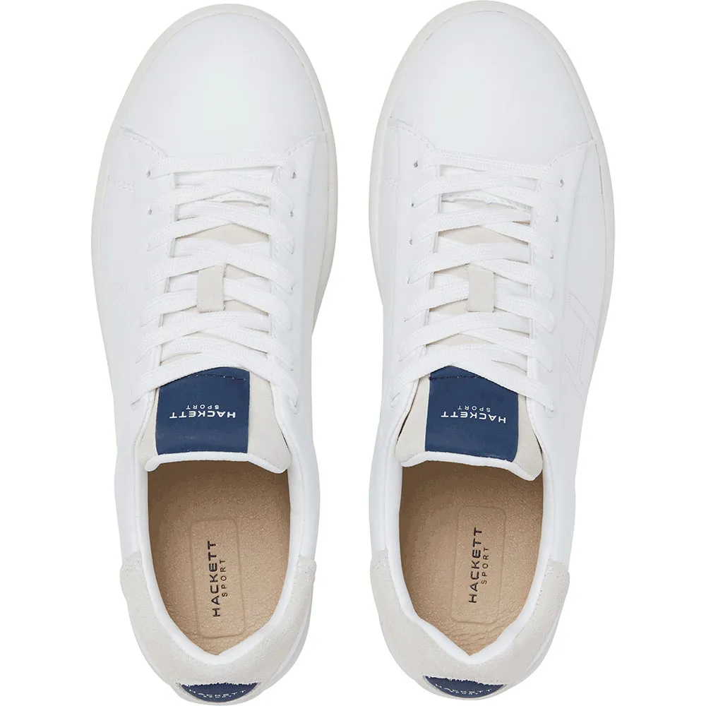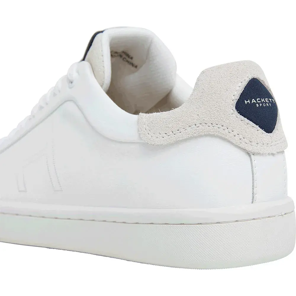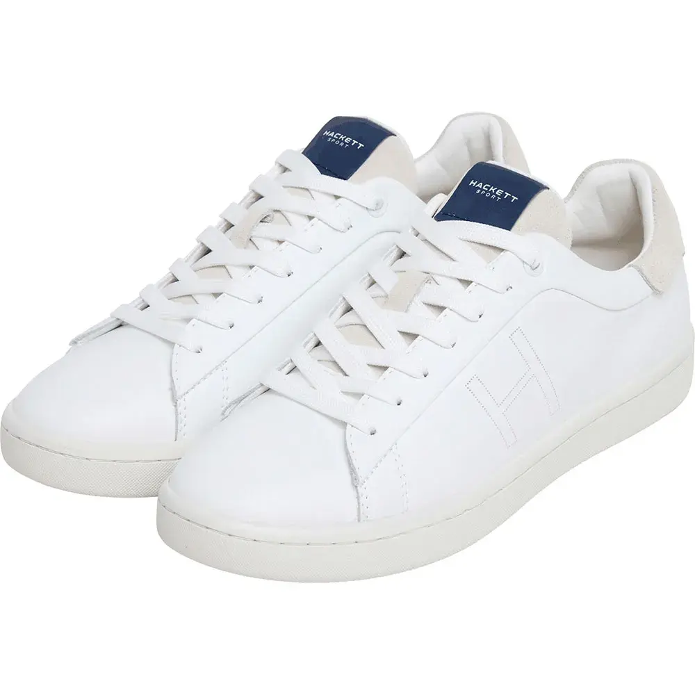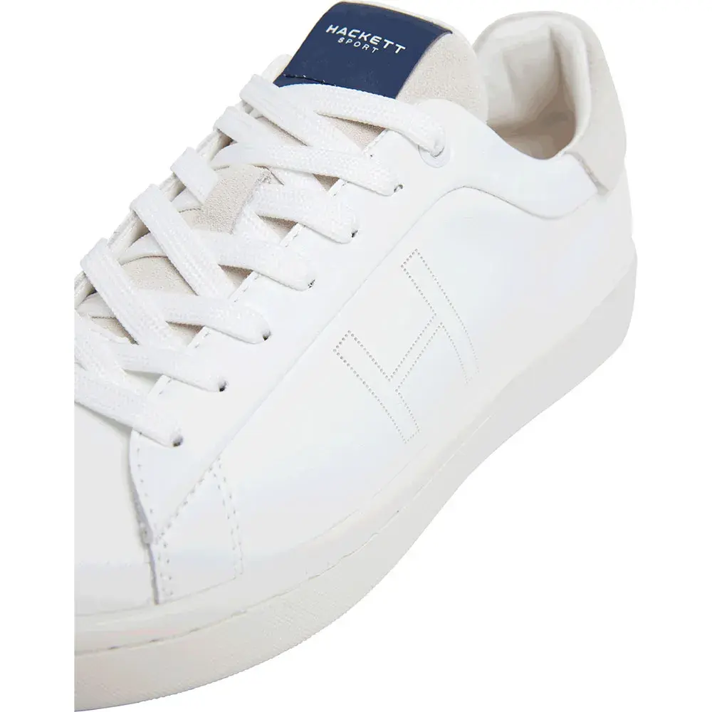 Минималистичные спортивные кроссовки Bond с непринужденными линиями, изготовленные из полностью переработанной кожи и коровьей замши, такие детали, как пятка, перфорированный логотип «H» на четверти и двухцветная резиновая подошва с логотипом Hackett Sport, съемная стелька.