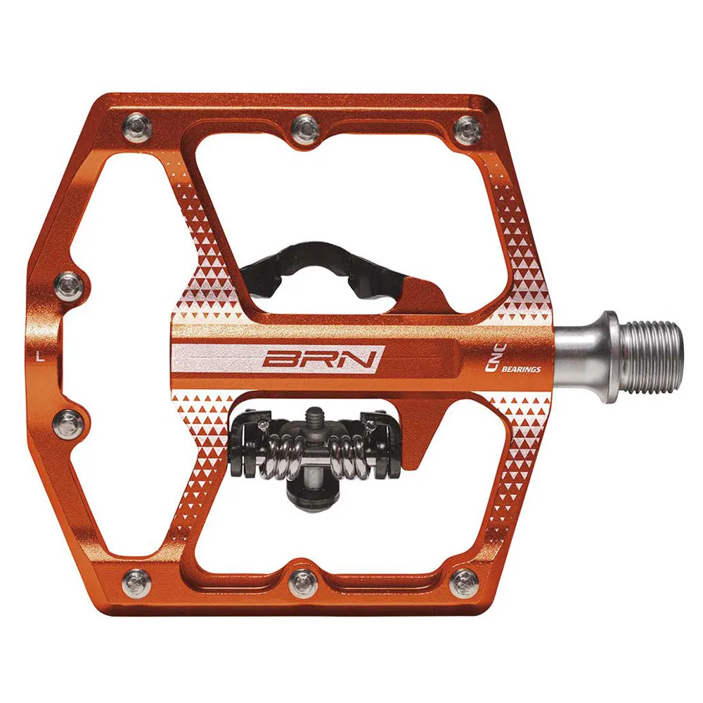 Двухфункциональные педали BRN Linx MTB/Gravel из оранжевого алюминия с ЧПУ, с осью Cr-Mo, 3 герметичными подшипниками и 8 съемными противоскользящими штифтами.