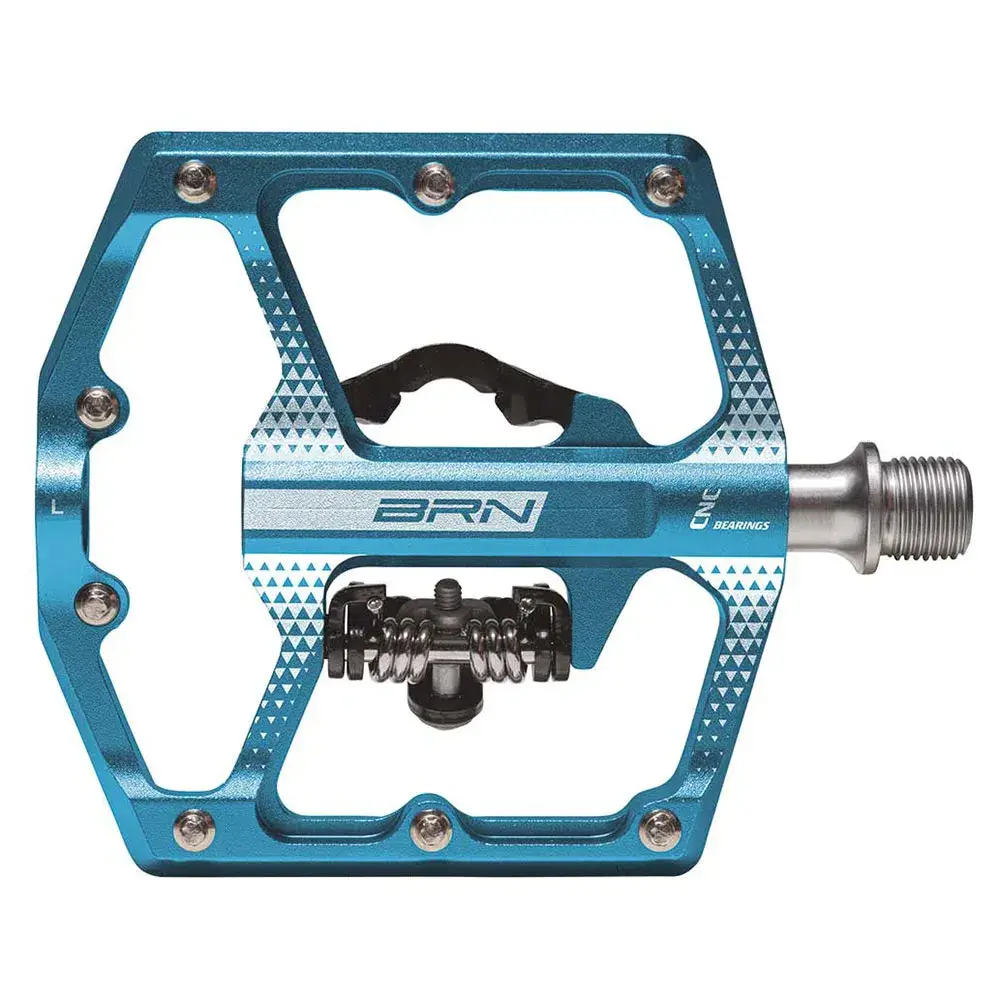 Двухфункциональные педали BRN Linx MTB/Gravel из синего алюминия с ЧПУ, с осью Cr-Mo, 3 герметичными подшипниками и 8 съемными противоскользящими штифтами.