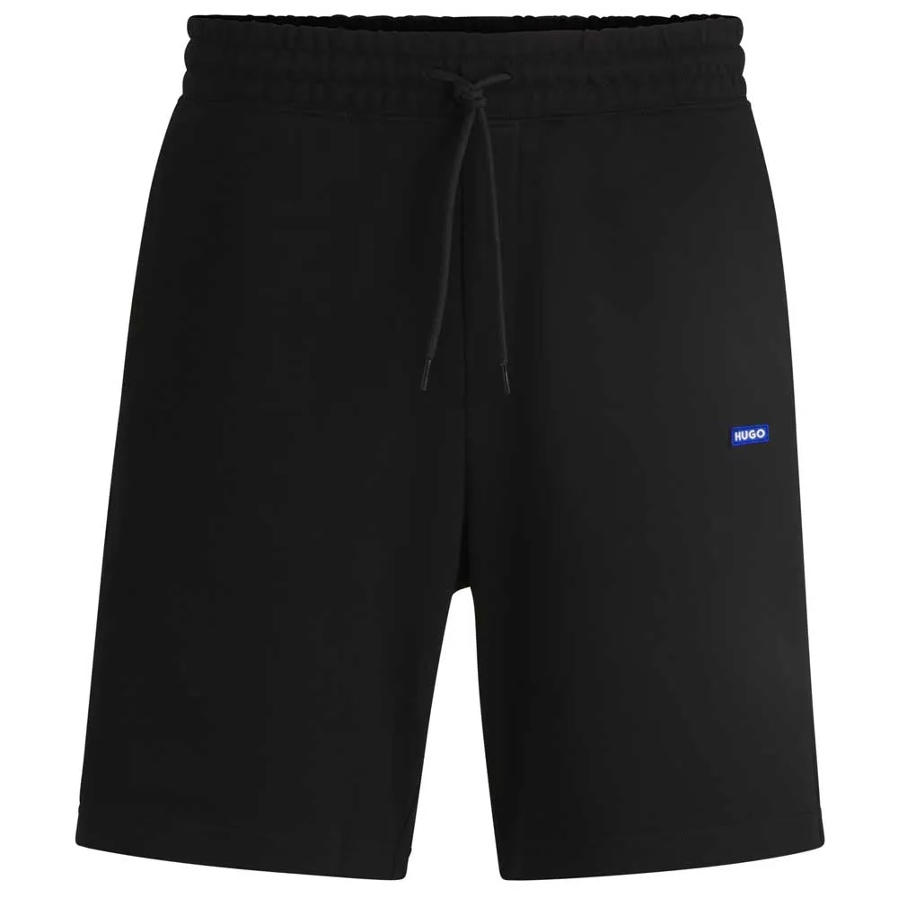 Маленькая прямоугольная нашивка с логотипом Hugo синего цвета на левой штанине.