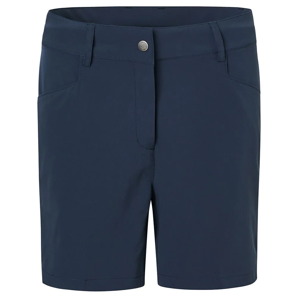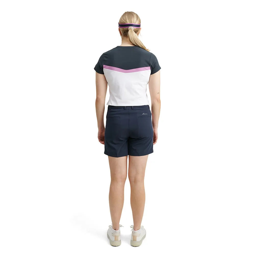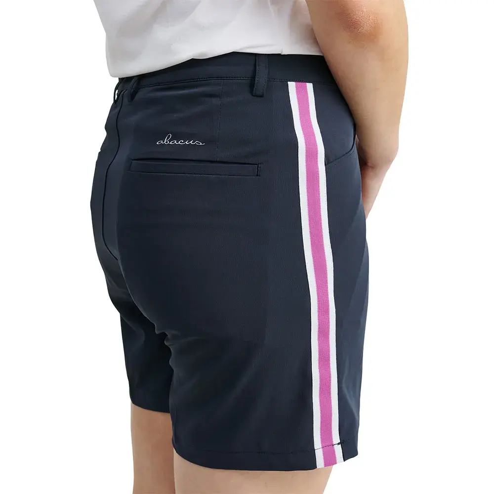 Шорты Brook Stripe изготовлены из функциональной ткани, которая тянется в четырёх направлениях и хорошо пропускает воздух. Ткань также обладает эффектом Drycool и отвода влаги. Два передних и два задних кармана, молния на ширинке, кнопка и шлёвки для ремня на поясе. Контрастная полосатая тесьма по бокам розового, фиолетового и белого цветов. Логотип Abacus над правым задним карманом. Средняя талия.