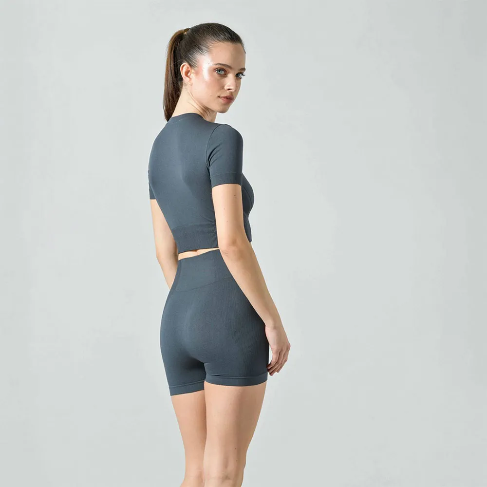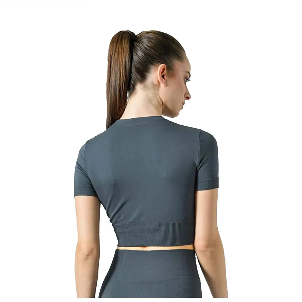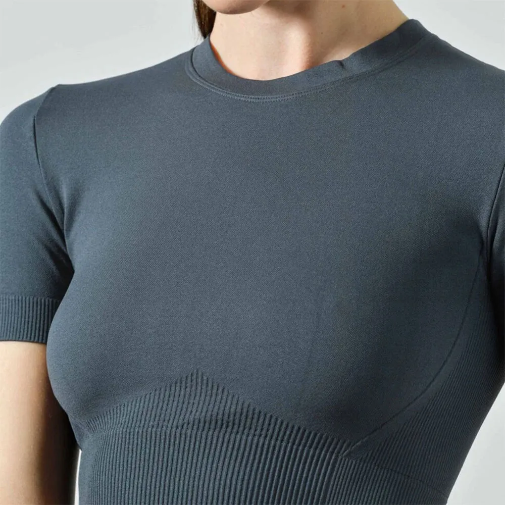 Топ из эластичной микрофибры с короткими рукавами и ребристыми деталями.