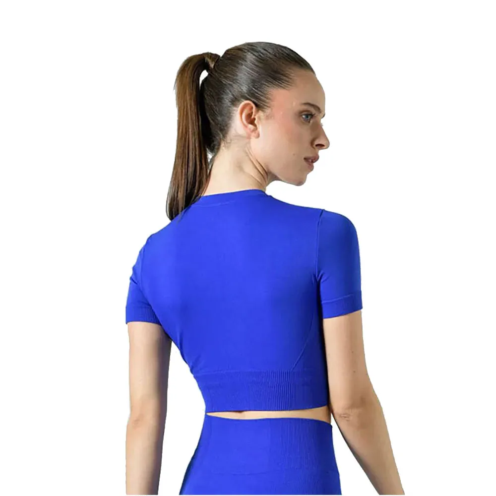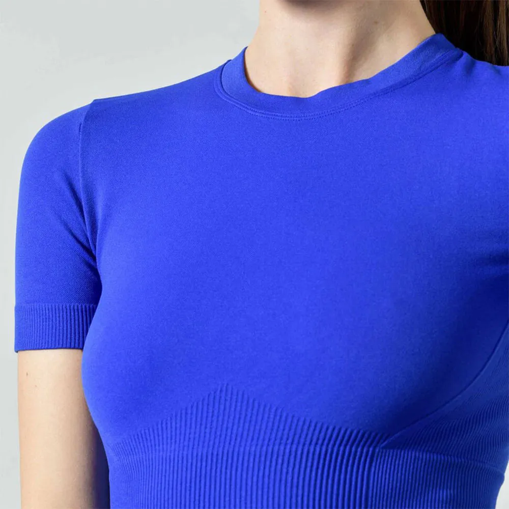 Топ из эластичной микрофибры с короткими рукавами и ребристыми деталями.