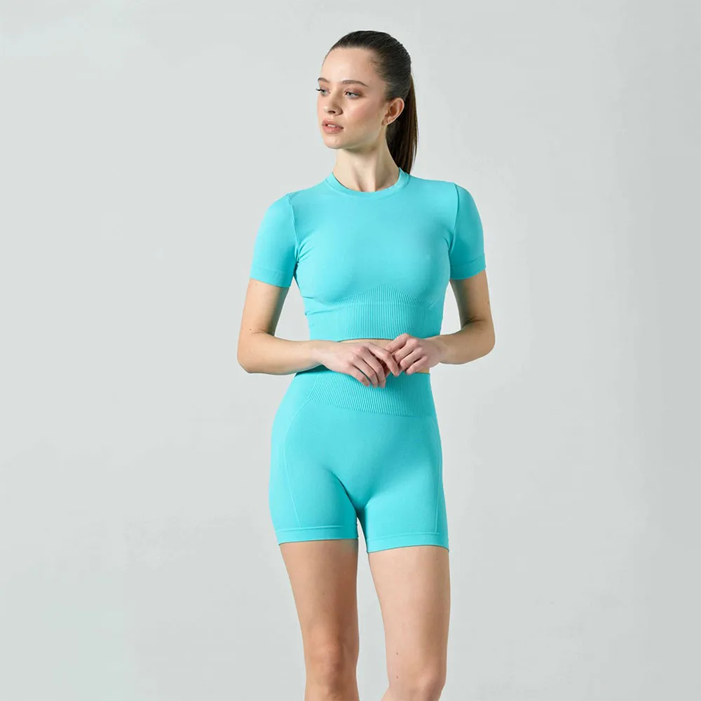 Топ из эластичной микрофибры с короткими рукавами и ребристыми деталями.
