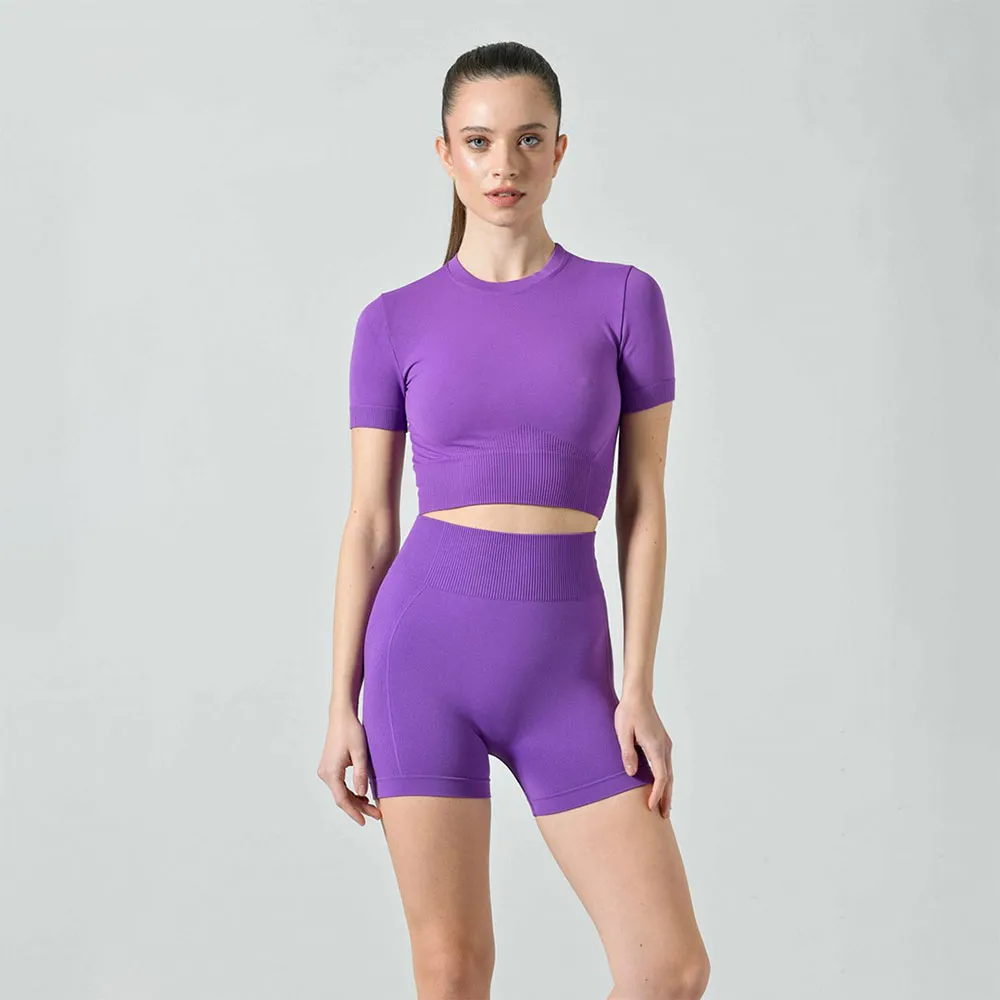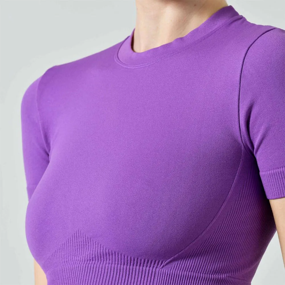 Топ из эластичной микрофибры с короткими рукавами и ребристыми деталями.