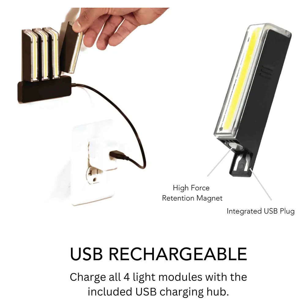 Модули Light имеют встроенный USB-разъем для удобной зарядки от любого стандартного USB-зарядного устройства (или с помощью прилагаемого 4-портового концентратора.).