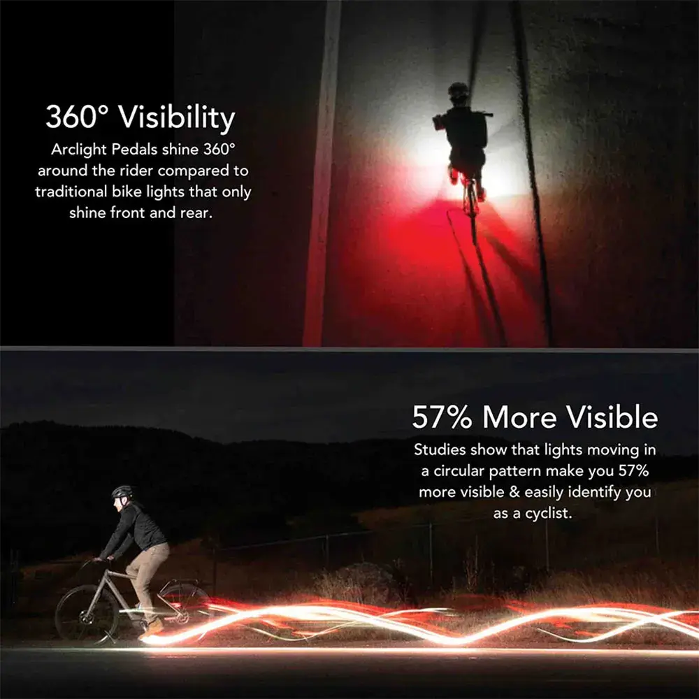 Круглый дизайн светодиодных велосипедных педальных модулей Arclight означает, что педали освещают каждый угол вашего велосипеда в ночное время, обеспечивая защиту от видимого света на 360 °.
