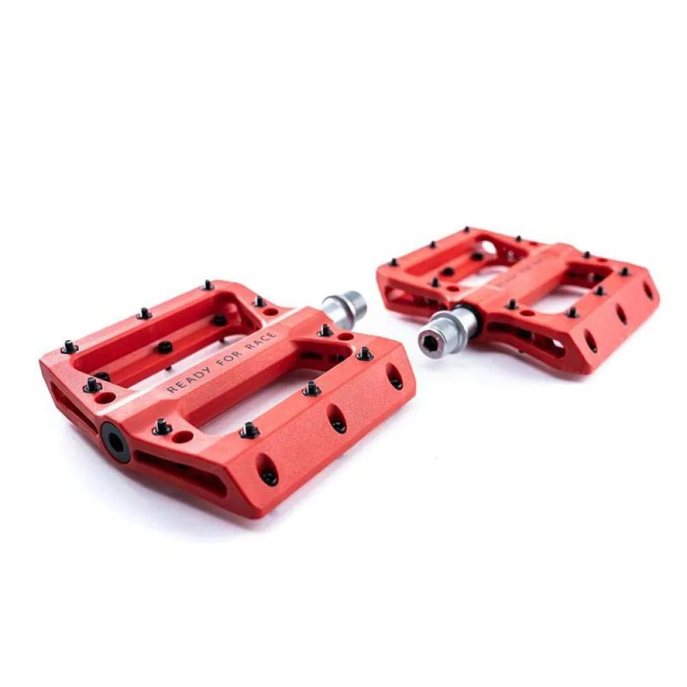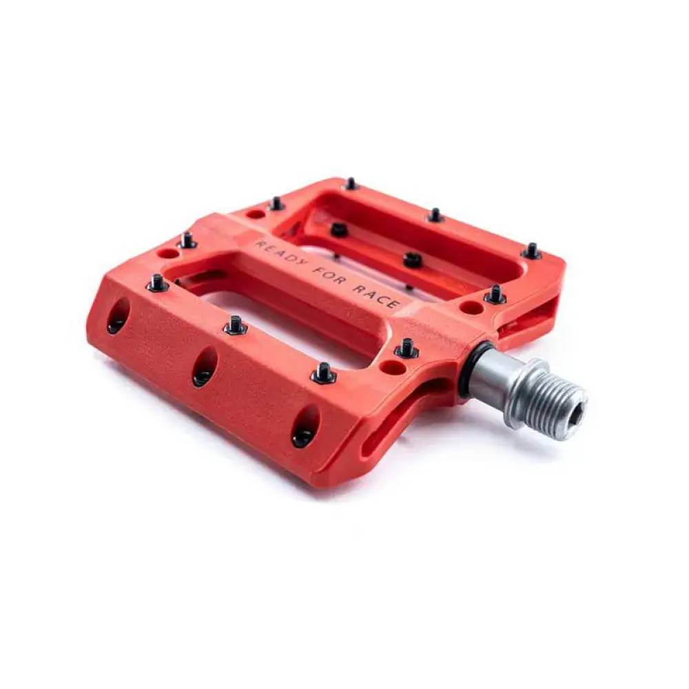 Сверхлегкая плоская педаль из технического термопластика. Хранится в промышленных условиях, со сменными нескользящими штифтами и цапфой CrMo.