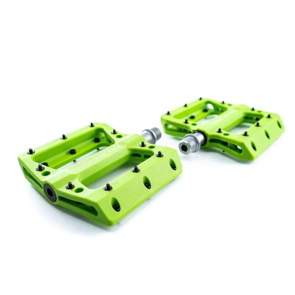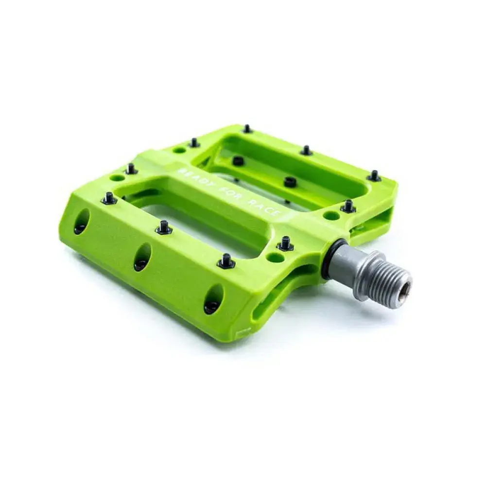 Сверхлегкая плоская педаль из технического термопластика. Хранится в промышленных условиях, со сменными нескользящими штифтами и цапфой CrMo.