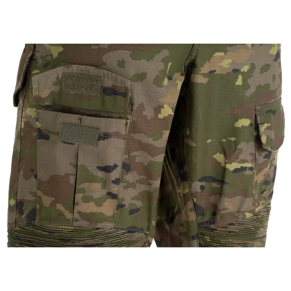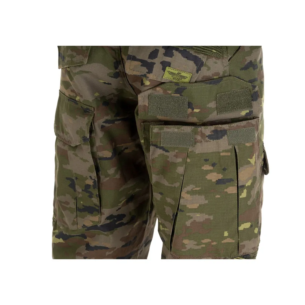 Компания Invader Gear была основана в 2004 году и всегда фокусировалась на снаряжении, предлагающем выдающееся соотношение цены и качества. Бренд в основном предлагает большой выбор тактической одежды в современных дизайнах в широкой гамме цветов и камуфляжных узоров, а также все виды нейлонового тактического снаряжения, такого как жилеты, разгрузочные жилеты, подсумки MOLLE, рюкзаки, защитные накладки, стропы и многое другое, что следует той же философии. Боевые брюки Predator Combat Pants разработаны для обеспечения уровня мобильности, вентиляции и защиты, который пользователь не найдет в классических брюках. Они изготовлены из ткани Rip-Stop (60% хлопок / 40% полиэстер), что делает брюки легкими и прочными. Они также быстро сохнут — независимо от того, жаркий это день или дождливая погода. Под поясом и вокруг колен расположена эластичная ткань для комфорта и высокой подвижности. Дополнительный уровень защиты обеспечивают входящие в комплект накладки, предназначенные для защиты суставов путем эффективного распределения энергии удара. Они плотно прилегают к пользователю благодаря регулировочной системе на внутренней стороне верхних карманов и ремням вокруг колен. В распоряжении пользователя несколько карманов: 2 открытых на талии, 2 больших кармана на каждой стороне бедра сзади с застежкой на липучке и 2 средних спереди, 2 маленьких кармана в области голени и еще 2 кармана на задней части брюк. Спереди мы можем найти высококачественную молнию YKK с застежкой на липучке. Ремешок проходит вокруг внутренней части пояса для регулировки его размера. Аналогичные ремешки расположены вокруг лодыжек для регулировки посадки по обуви пользователя. Большие шлевки для ремня позволяют использовать широкий спектр тактических ремней.