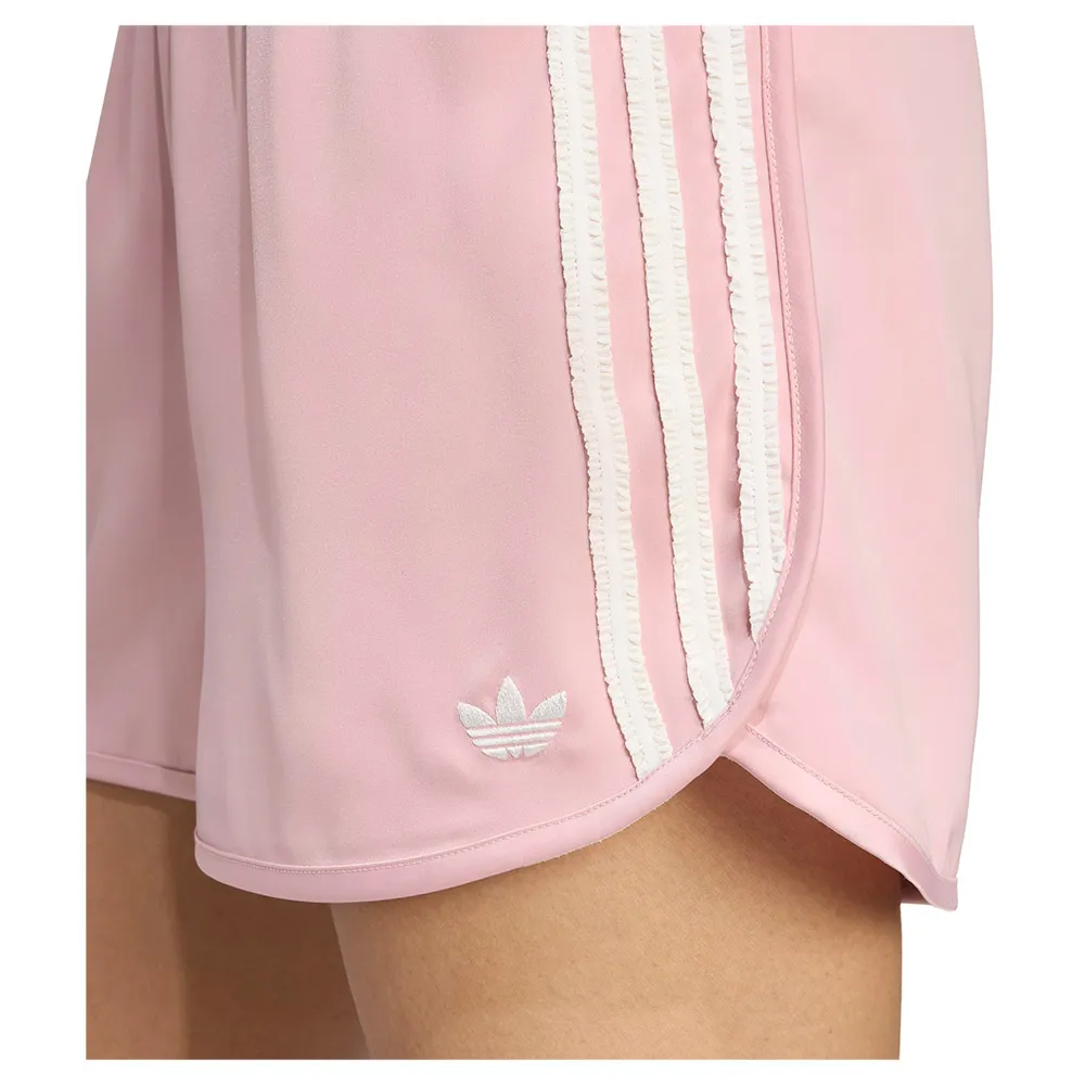 Полоски с рюшами выделяются на шелковистом гладком атласе, придавая классическому спортивному стилю нотку шика.