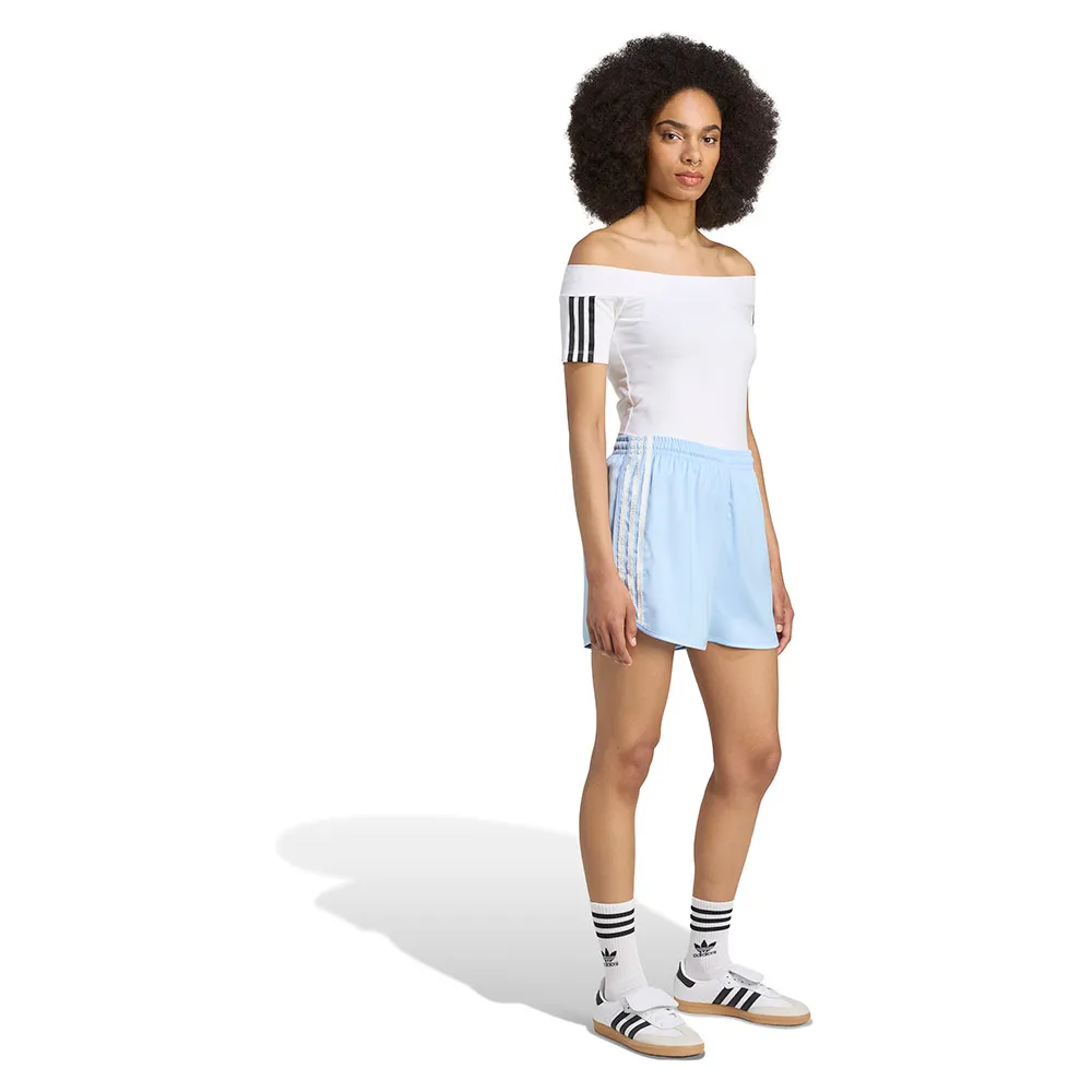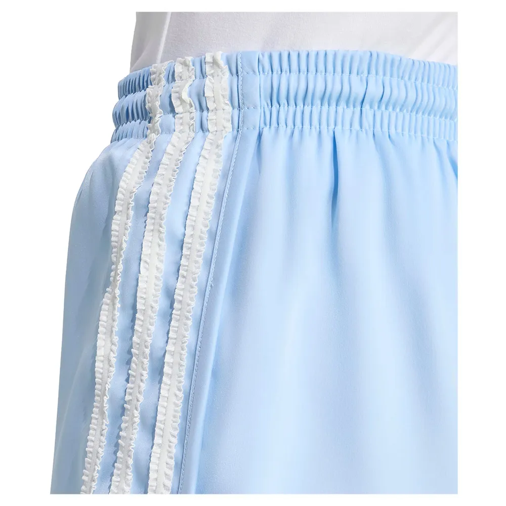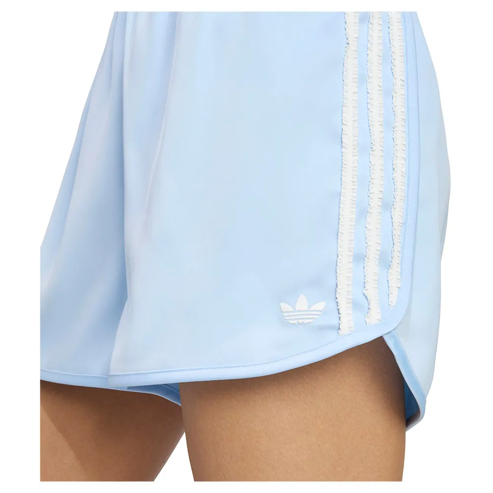 Полоски с рюшами выделяются на шелковистом гладком атласе, придавая классическому спортивному стилю нотку шика.