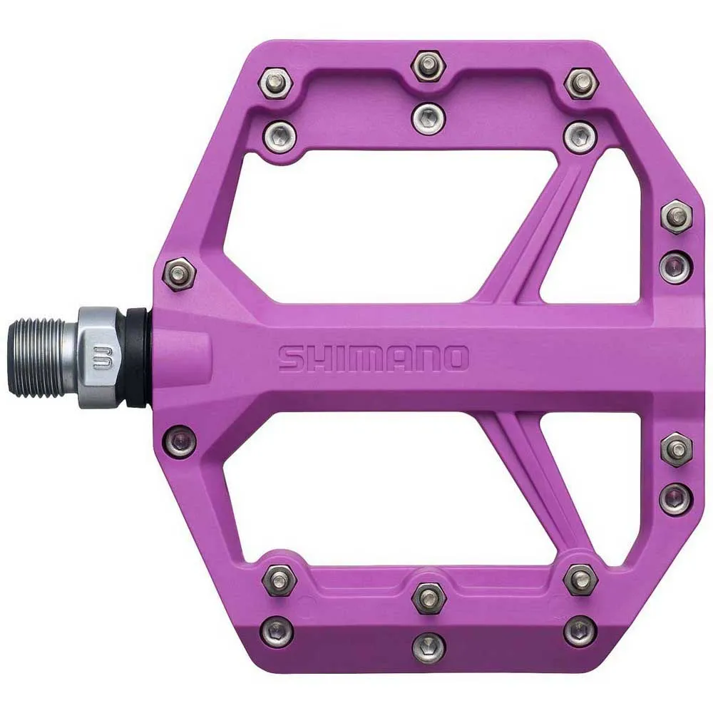 Педали SHIMANO PD-GR400 ярко-фиолетового цвета придадут вашей поездке индивидуальности. Эти универсальные плоские педали предназначены как для отдыха, так и для катания по тропе, обеспечивая удобную и уверенную платформу для ваших ног.