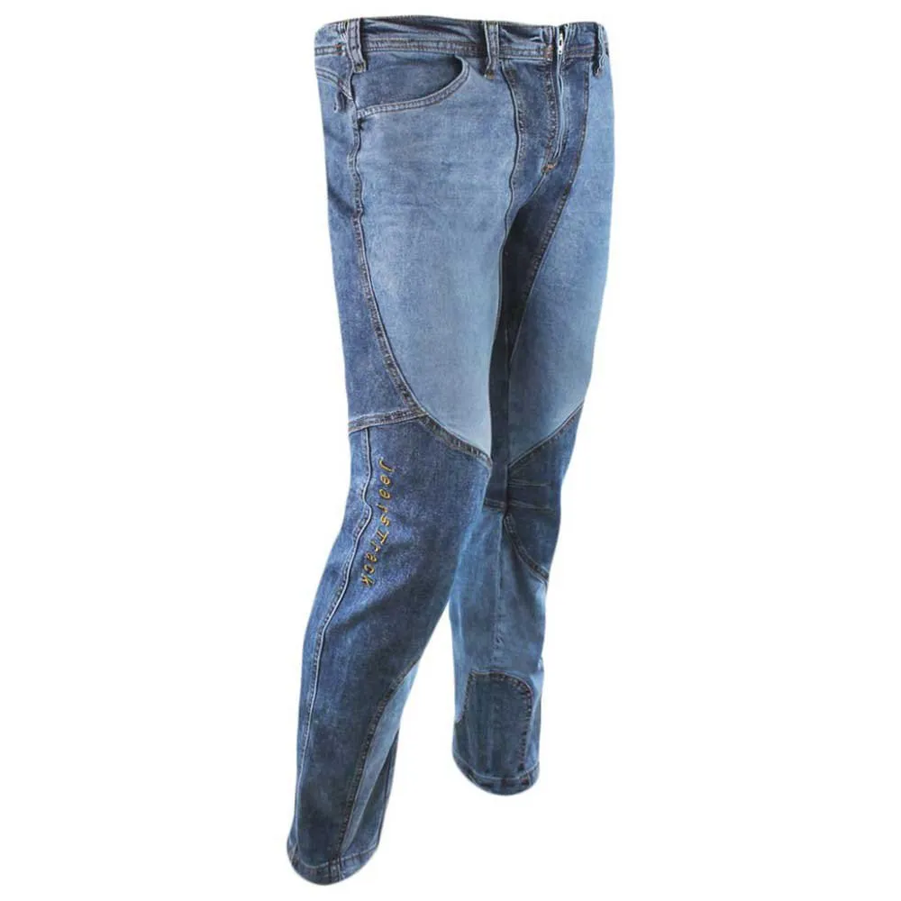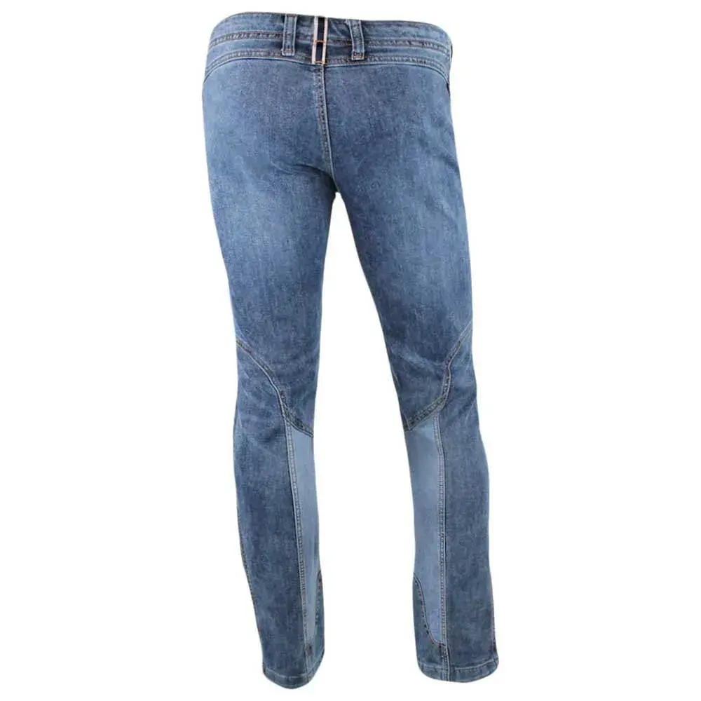 Сверхэластичная джинсовая ткань, изготовленная из 9,5 унций Lycra, закрывает области наибольшего трения, обеспечивая прочность и долговечность без потери свободы движений.