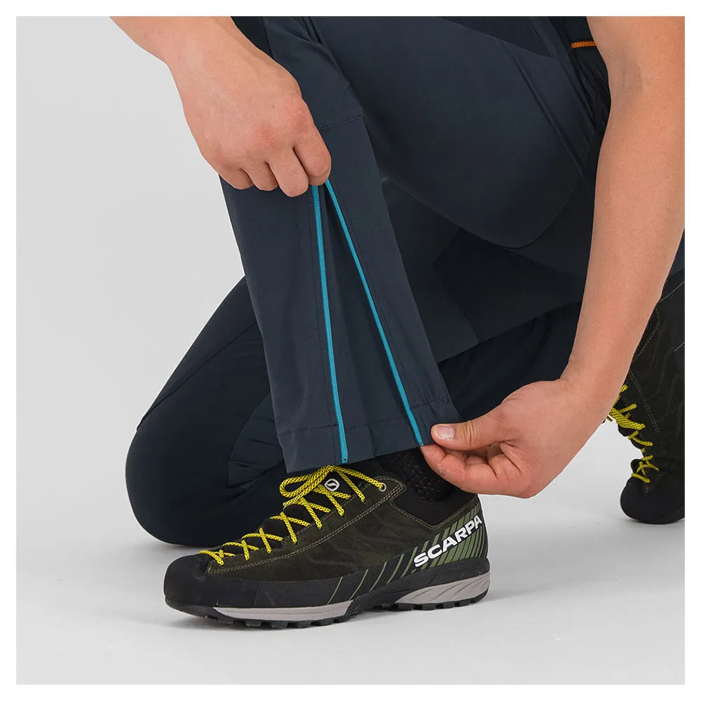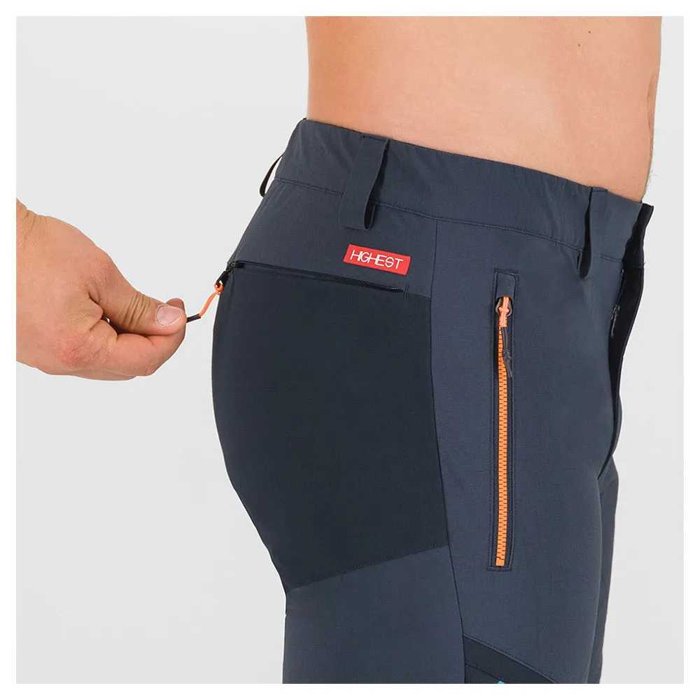 Внешняя часть выполнена из двух эластичных тканей для отличной посадки и свободы движений, обработанных водоотталкивающей пропиткой DWR без содержания перфторуглеродов (PFC). Колени, нижняя часть штанин и ягодицы выполнены из износостойкого нейлона/Cordura, а остальная часть изделия — из мягкой и дышащей переработанной нейлоновой ткани. Зона коленей и ягодиц отделана легкой эластичной сеткой.