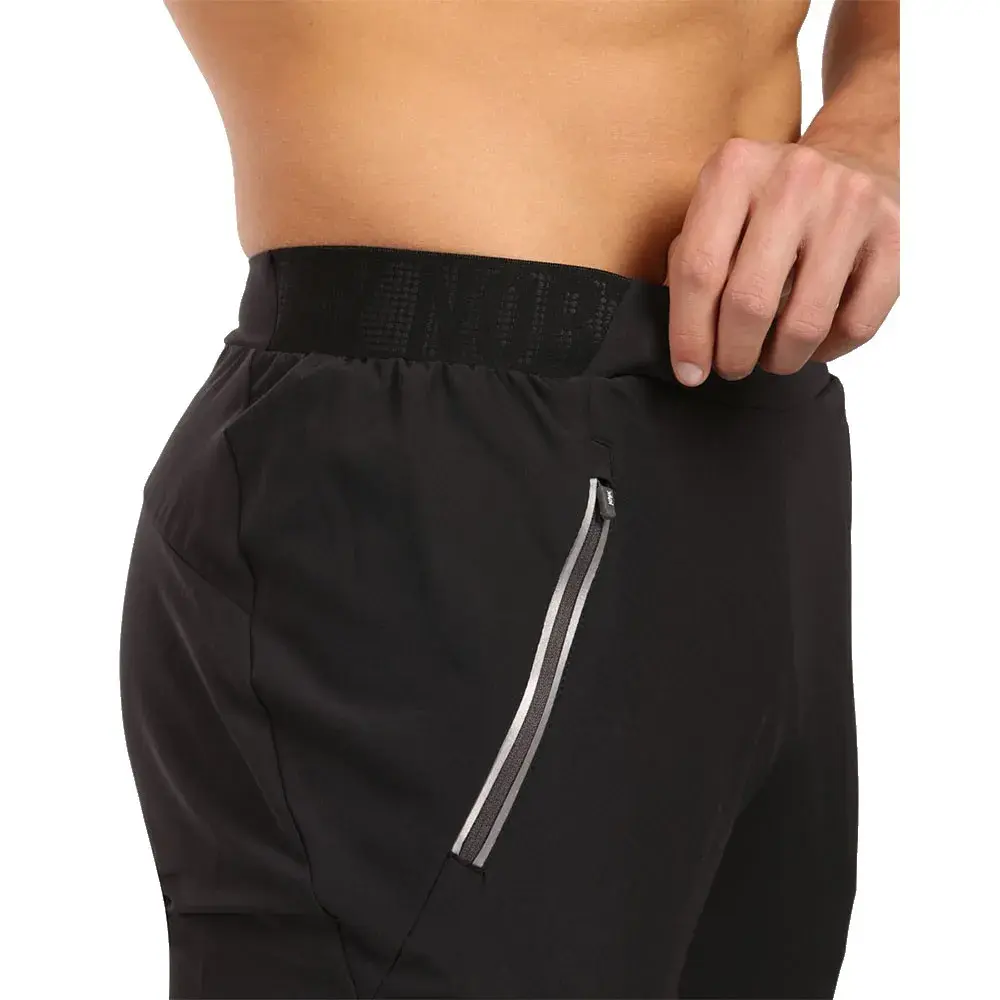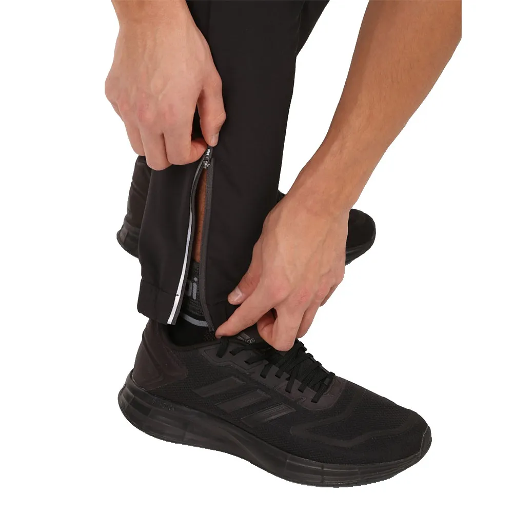 Брюки имеют два кармана на молнии, а нижний край отделан молнией, что облегчает надевание их поверх беговой обуви.