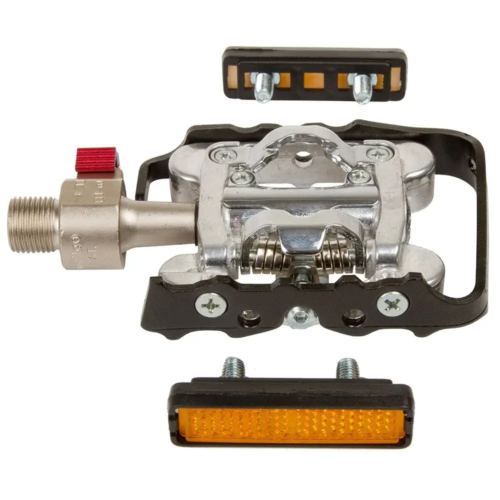 Педали WELLGO Half Clipless разработаны с учетом требований городской езды на велосипеде, обеспечивая устойчивую и удобную платформу для ваших ног. Сторона без клипс оснащена прочным и надежным механизмом, совместимым со стандартными шипами SPD (шипы в комплект не входят), обеспечивающим надежную фиксацию для эффективного вращения педалей и максимальной отдачи мощности во время спринтов и подъемов. Обратная сторона обеспечивает широкую, цепкую плоскую платформу для повседневной езды или при ношении повседневной обуви, что дает вам возможность садиться на велосипед и слезать с него без необходимости постоянно пристегиваться.