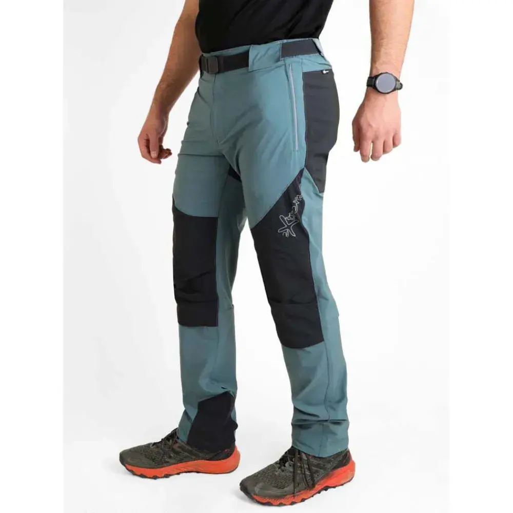 Полуэластичный пояс с застежкой на кнопки, регулируемый эластичный пояс, четыре кармана (спереди и сзади полуврезные, небольшой боковой карман на молнии с обратной стороны и светоотражающим логотипом), ткань против натирания на ягодицах, коленях и подоле, вытачки на коленях, регулируемая резинка на подоле, светоотражающая отделка сзади, светоотражающий логотип. Двойная ткань на коленях с местом для протекторов.