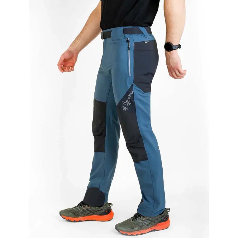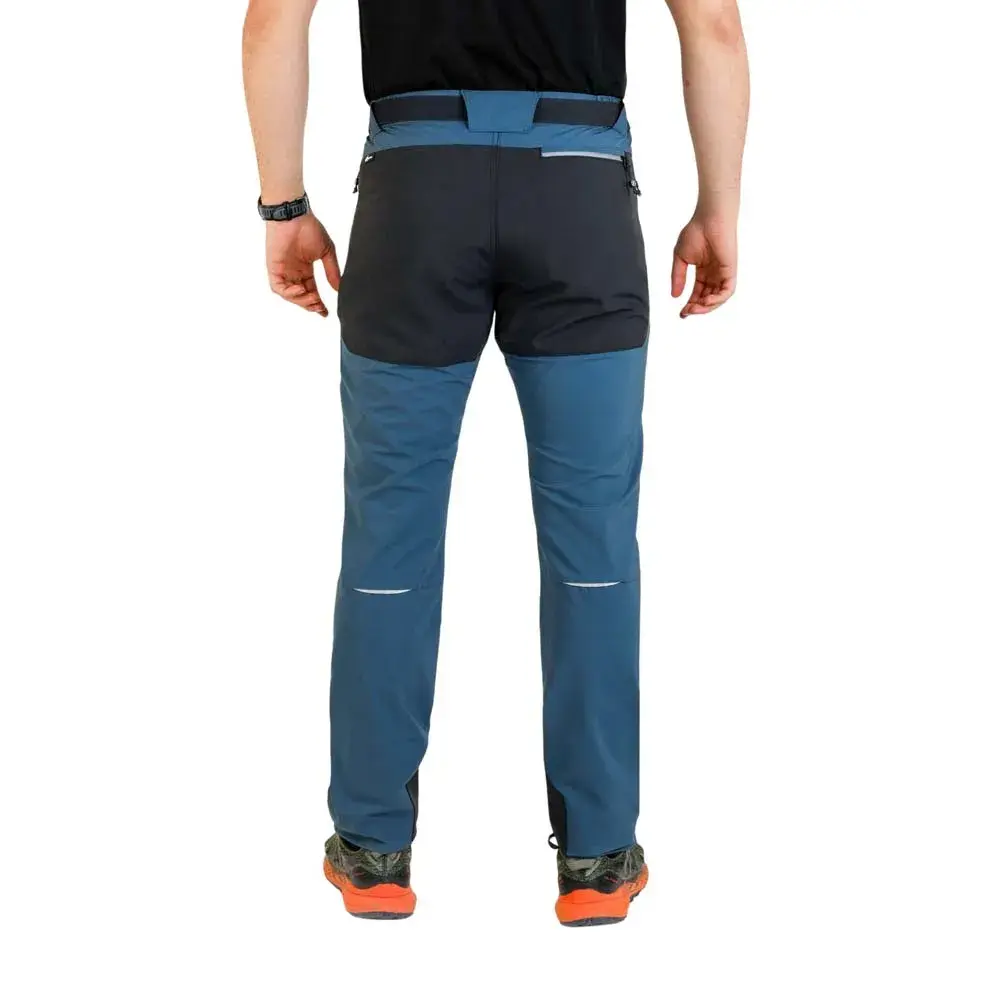 Полуэластичный пояс с застежкой на кнопки, регулируемый эластичный пояс, четыре кармана (спереди и сзади полуврезные, небольшой боковой карман на молнии с обратной стороны и светоотражающим логотипом), ткань против натирания на ягодицах, коленях и подоле, вытачки на коленях, регулируемая резинка на подоле, светоотражающая отделка сзади, светоотражающий логотип. Двойная ткань на коленях с местом для протекторов.