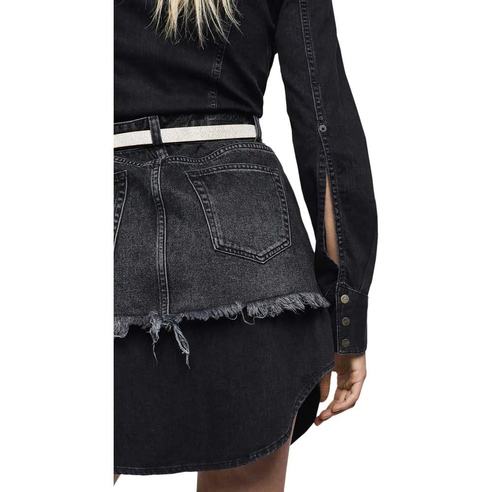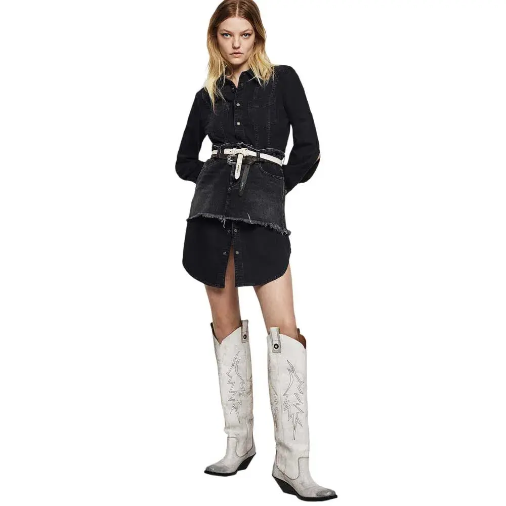 Оно дополнено мини-юбкой с бахромой и пятью карманами, которая застегивается спереди на пуговицы.