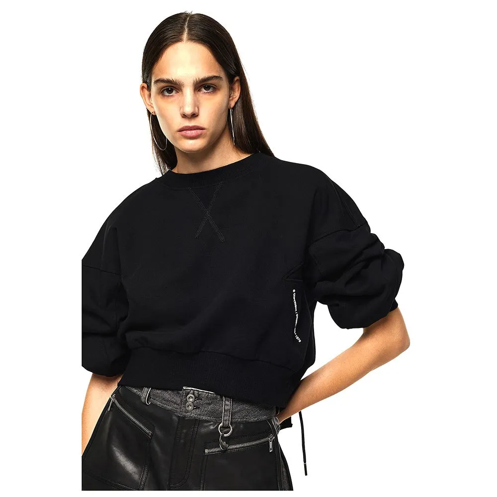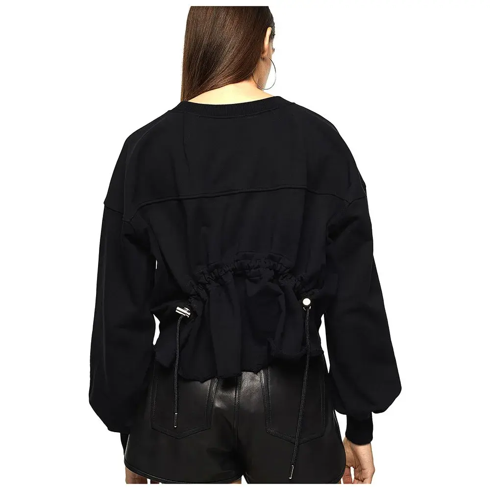 Эта толстовка, изготовленная из хлопкового трикотажа с петельчатой изнанкой, имеет укороченные рукава-баллоны и спинку, завязывающуюся на шнурок.
