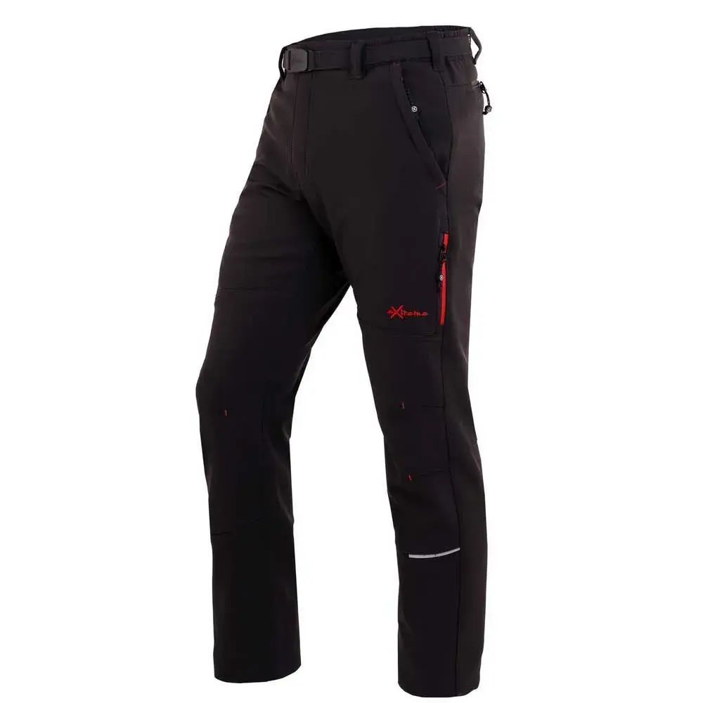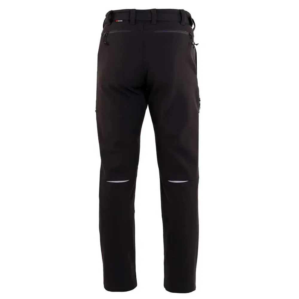 Технический крой, полуэластичная талия с застежкой на кнопки и регулируемым поясом, 6 карманов с втянутыми водоотталкивающими молниями, светоотражающая отделка, регулируемая резинка по низу, складки в области колен.