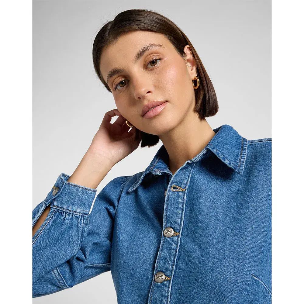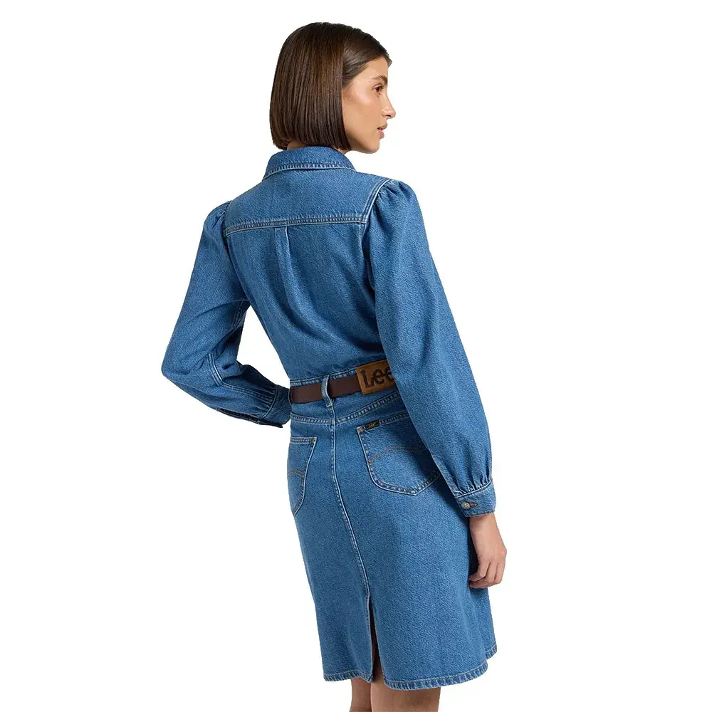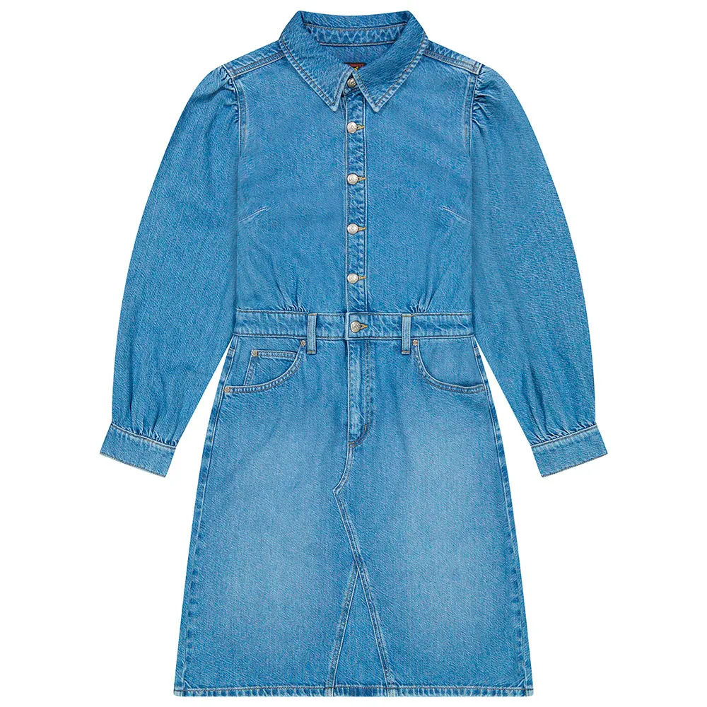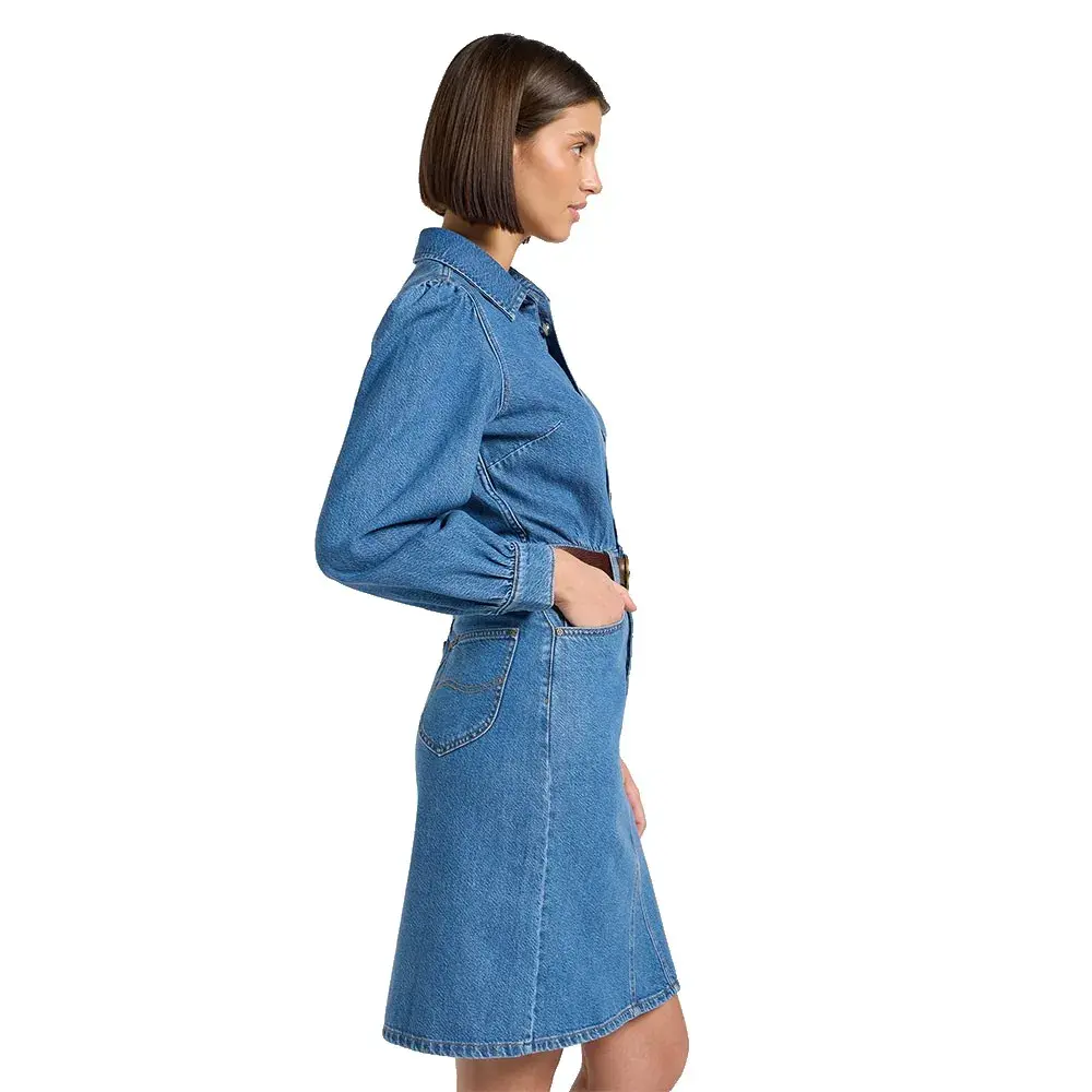 Изготовленное из легкой жесткой джинсовой смеси лиоцелла плотностью 10 3/4 унции, это платье включает в себя множество классических деталей, таких как модель с пятью карманами, традиционная строчка и скошенная кокетка.