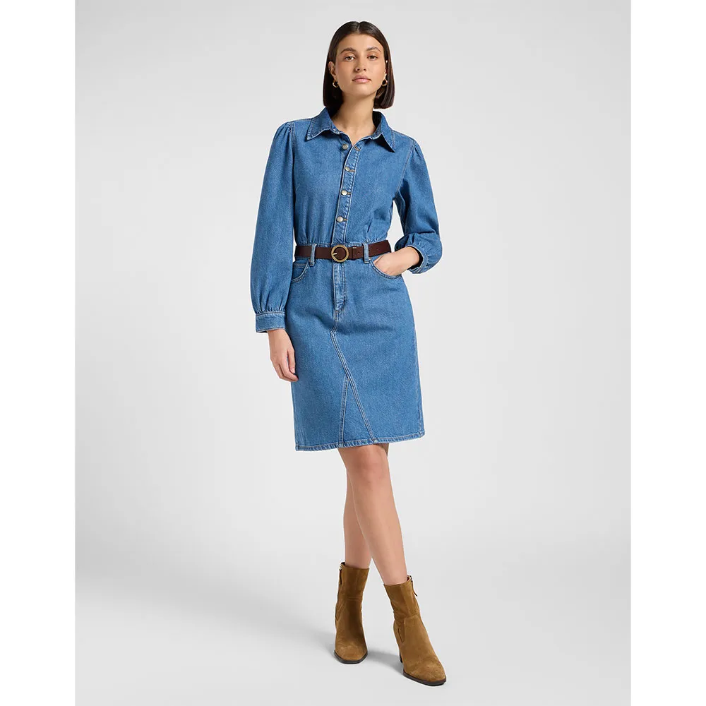 Это классическое джинсовое платье женственно благодаря таким особенностям, как рукава-фонарики, приталенная талия и юбка А-силуэта.