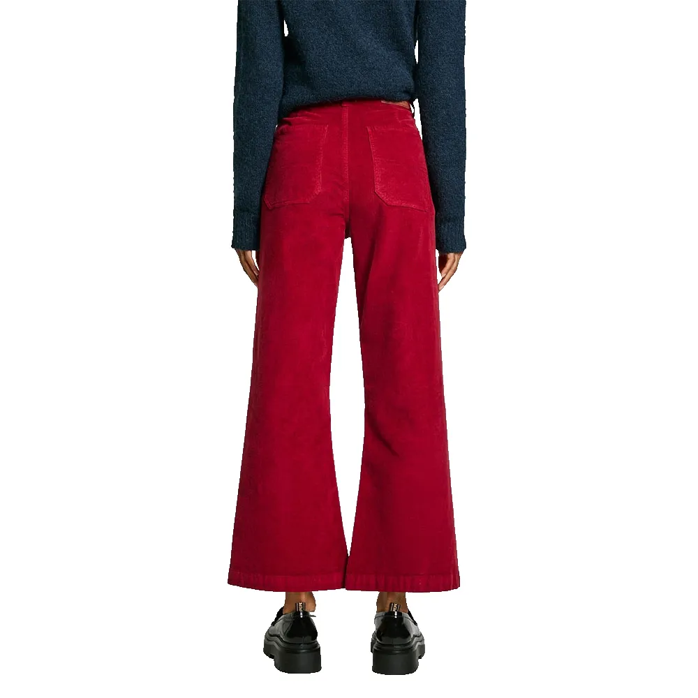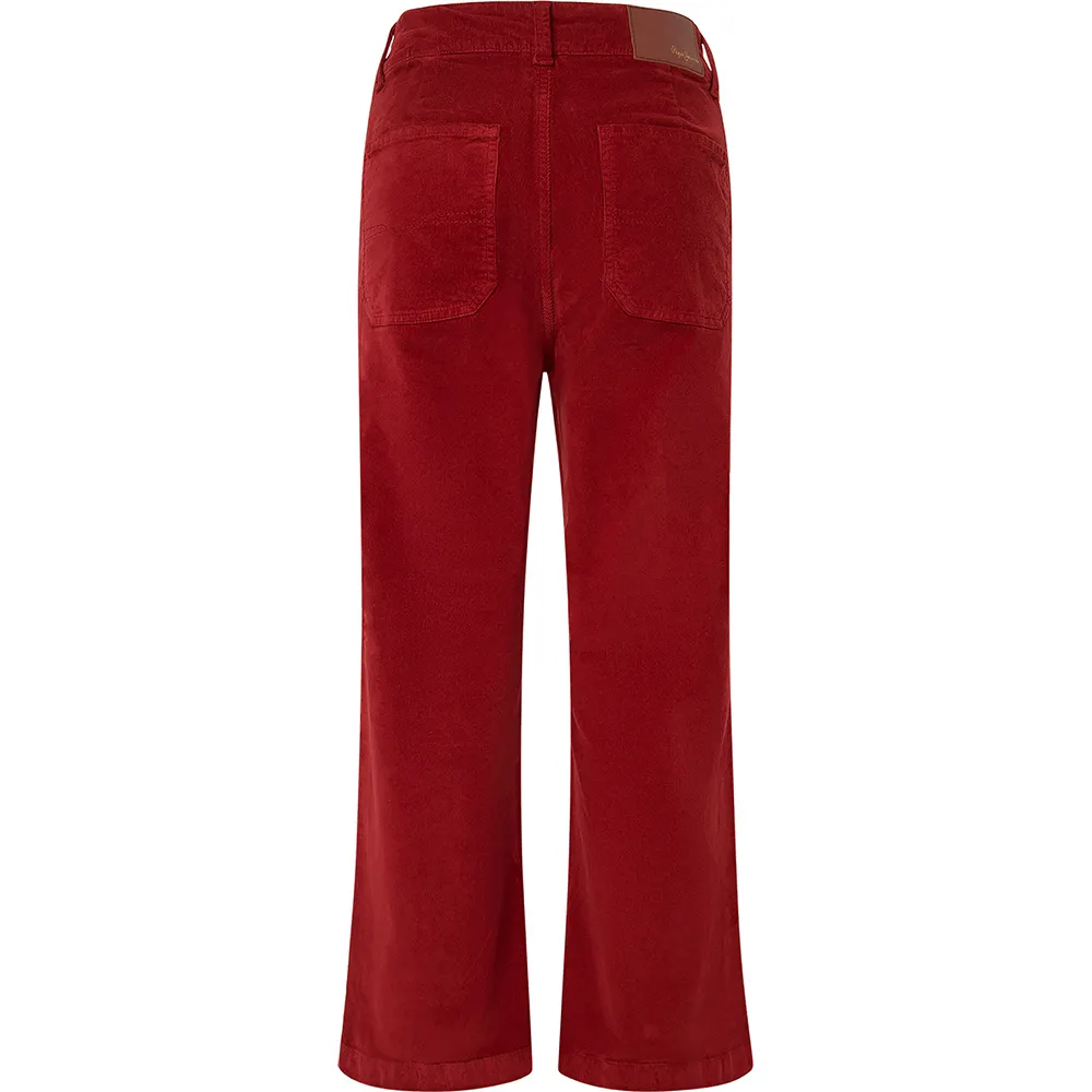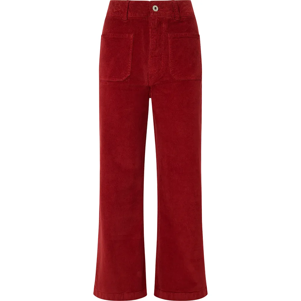 Длинные брюки с поясом и шлевками для ремня. Передняя часть с двумя накладными карманами по бокам и функциональной застёжкой на пуговицу и молнию. Задняя часть с вытачками и накладными карманами. Низ обработан отстрочкой.