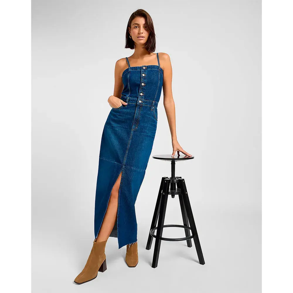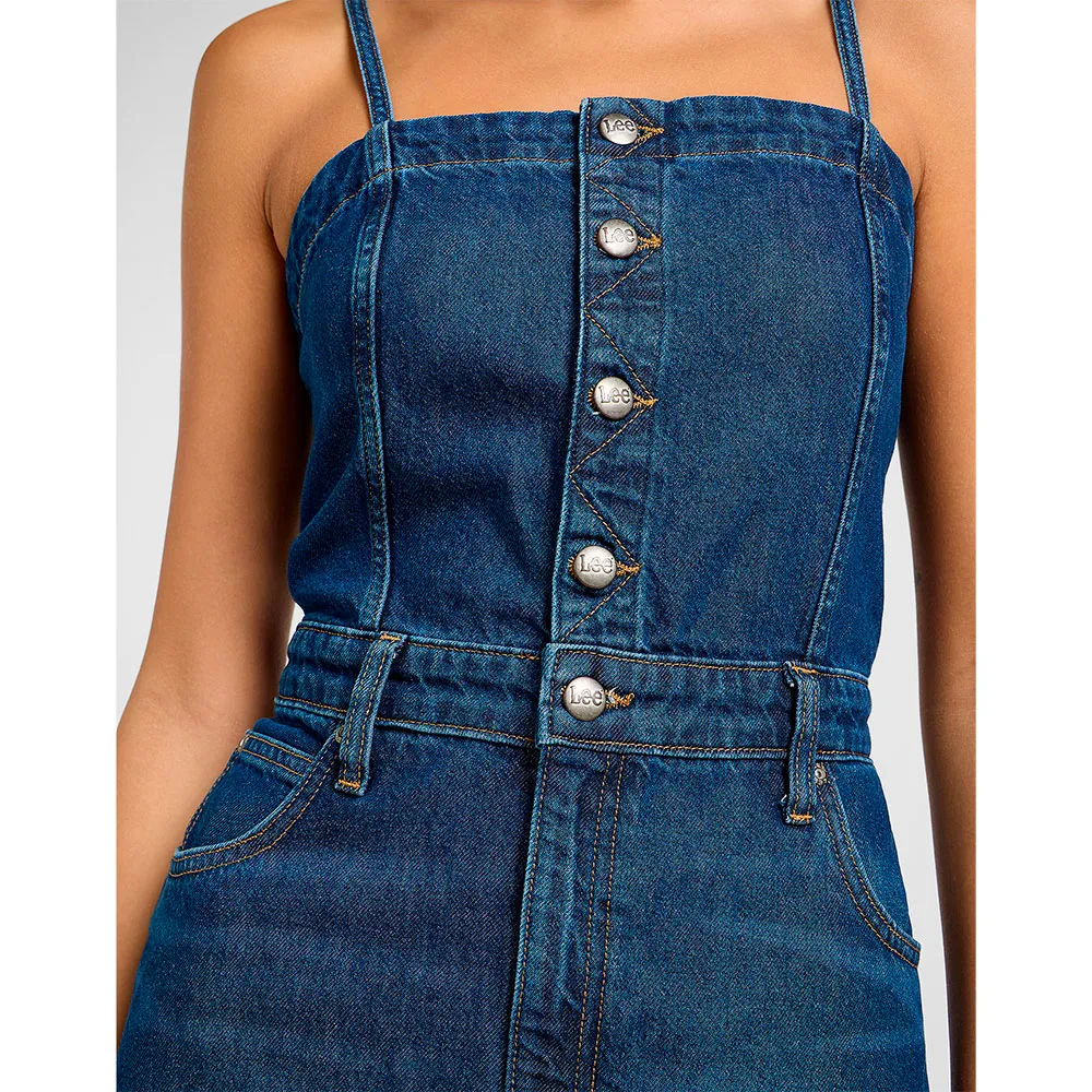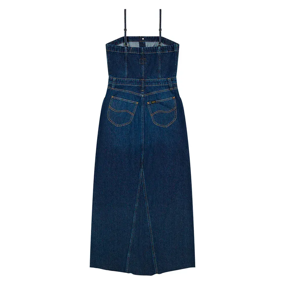 Сделано из денима плотностью 9,5 унций для аутентичного вида и На ощупь оно отличается классическими деталями дизайна Lee, регулируемыми бретельками для идеальной посадки и необработанным краем.