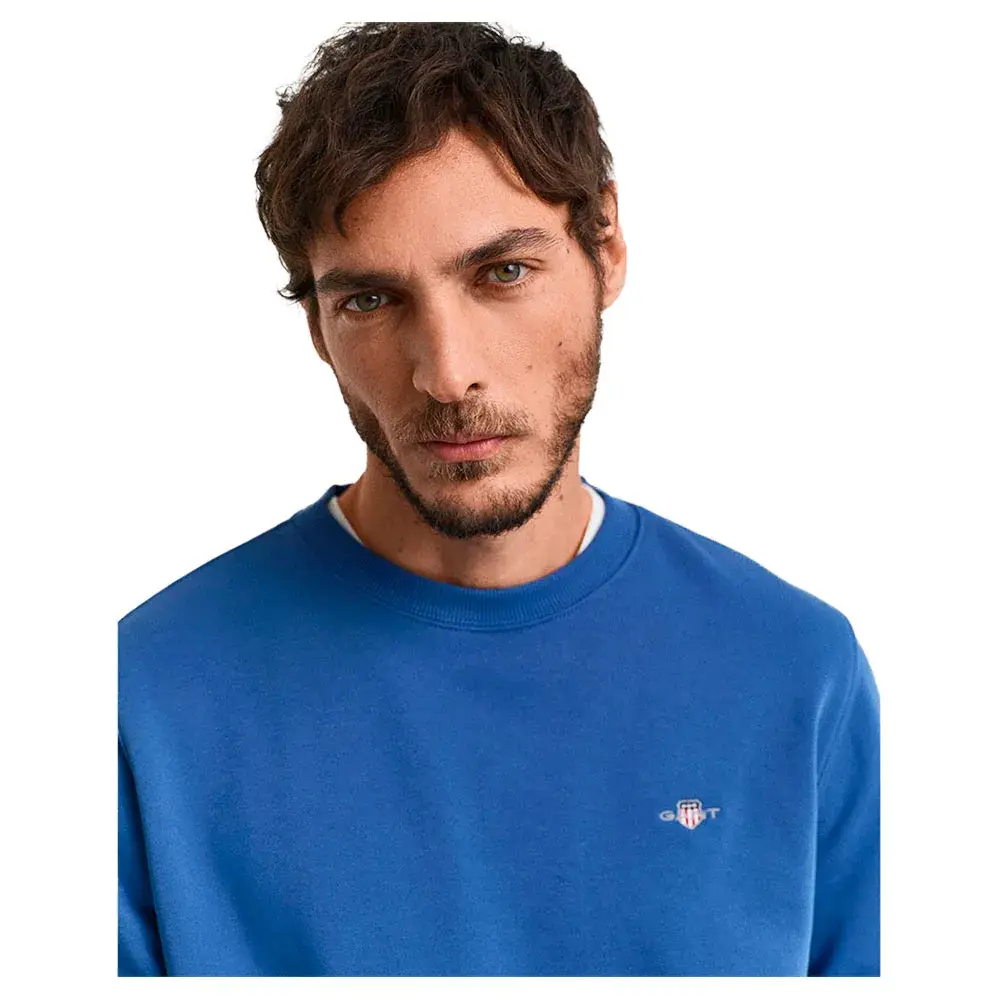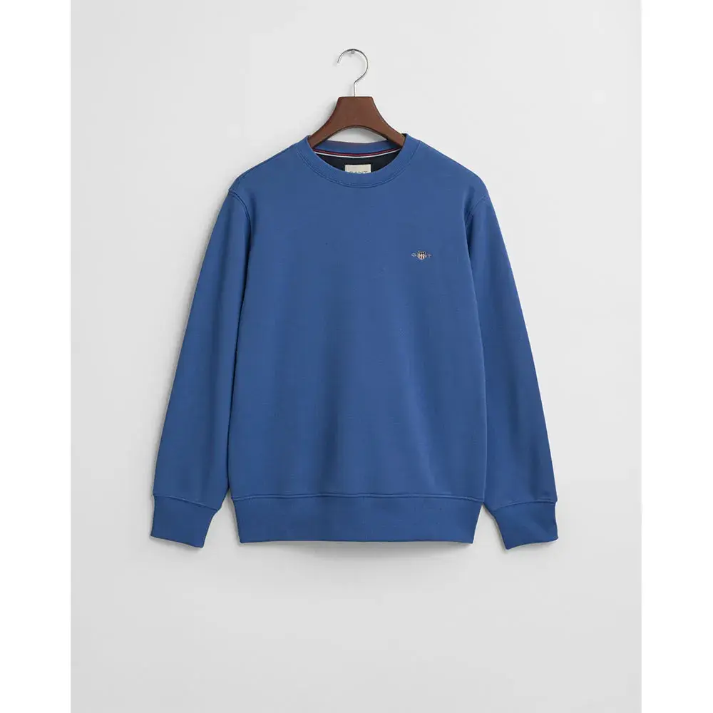 Она дополнена классическим круглым вырезом, ребристым подолом и манжетами, а также небольшой вышитой графикой щита GANT на груди.