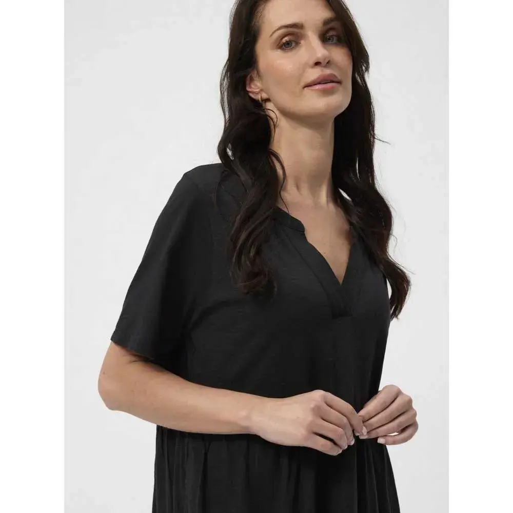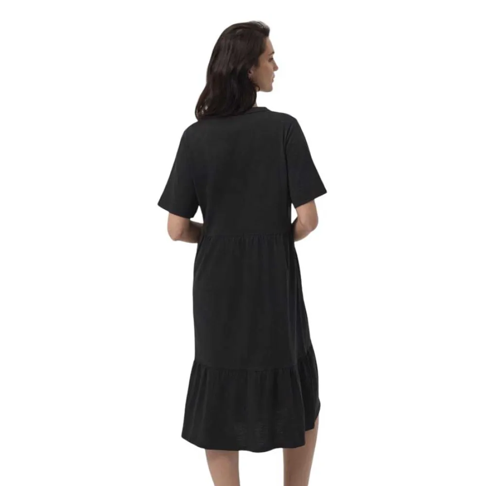 Это платье с классическим коротким рукавом обеспечивает элегантную и удобную посадку для рук. Искусно подобранный силуэт красиво драпируется, не облегая тело, создавая привлекательный силуэт для любой фигуры. Ключевой функциональной деталью являются едва заметные боковые разрезы по подолу, которые не только добавляют нотку современности, но и повышают подвижность и комфорт при каждом шаге. Классический круглый вырез завершает вневременную эстетику платья-футболки, гарантируя, что оно останется актуальным и желанным предметом гардероба на протяжении многих сезонов.