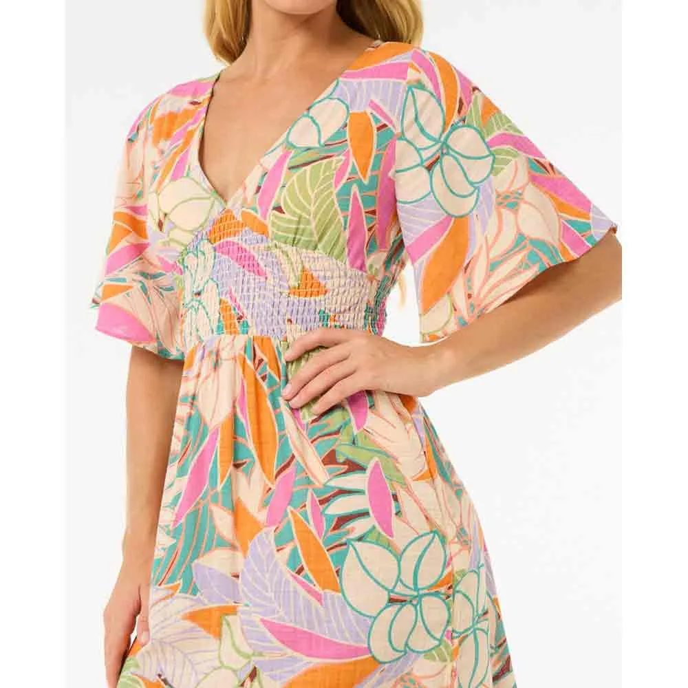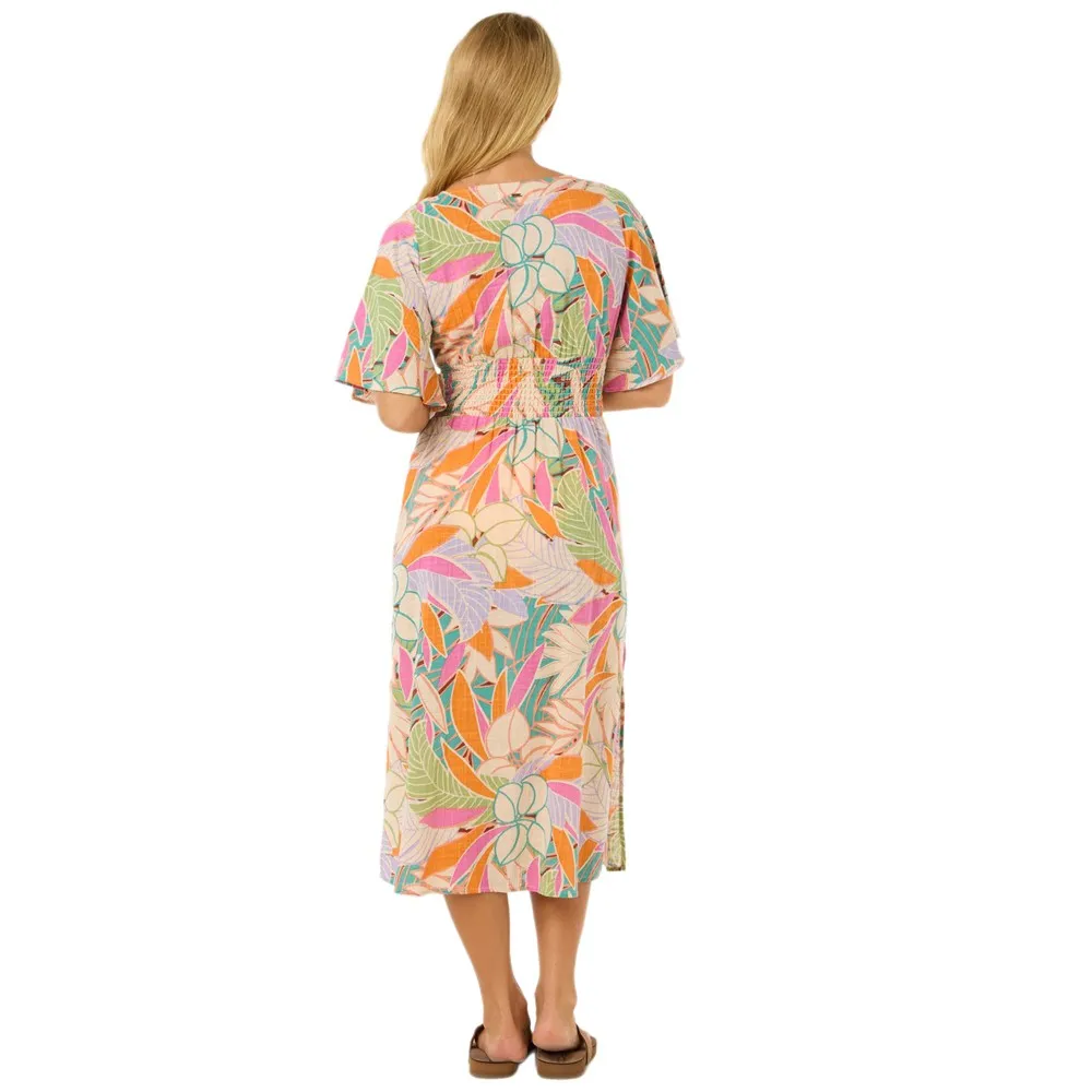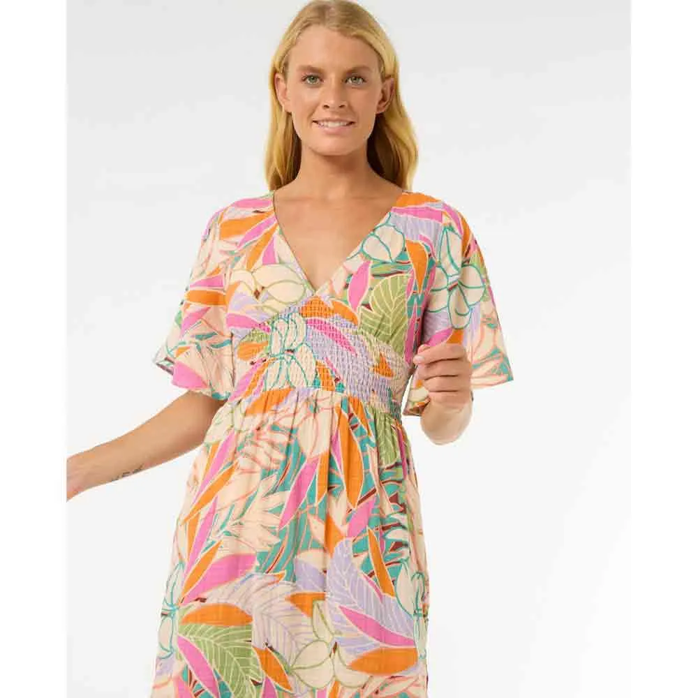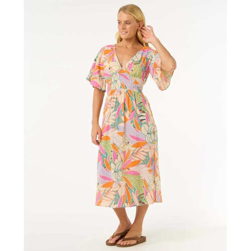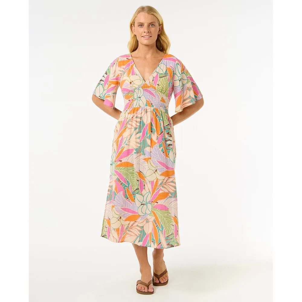 Платье миди Cala Vadella отличается сборками, регулируемой бретелькой сзади и контрастной окантовкой.