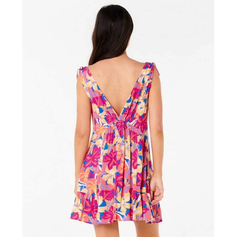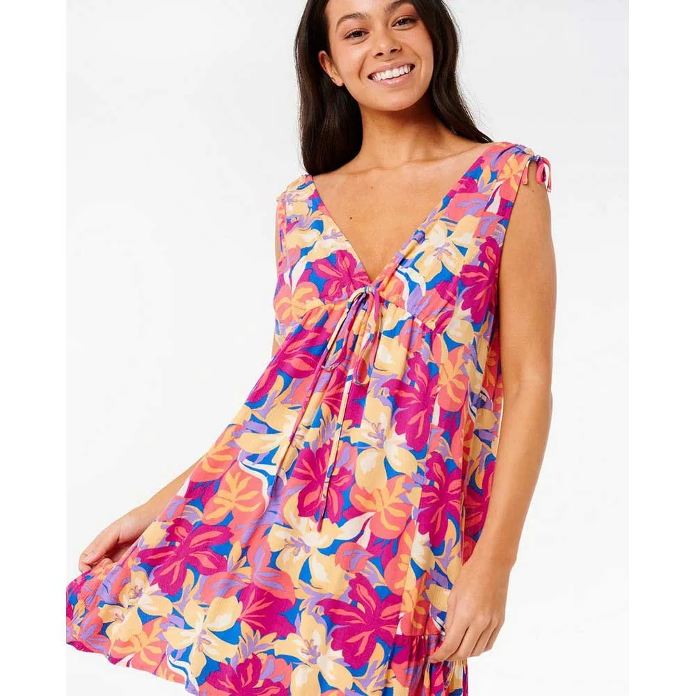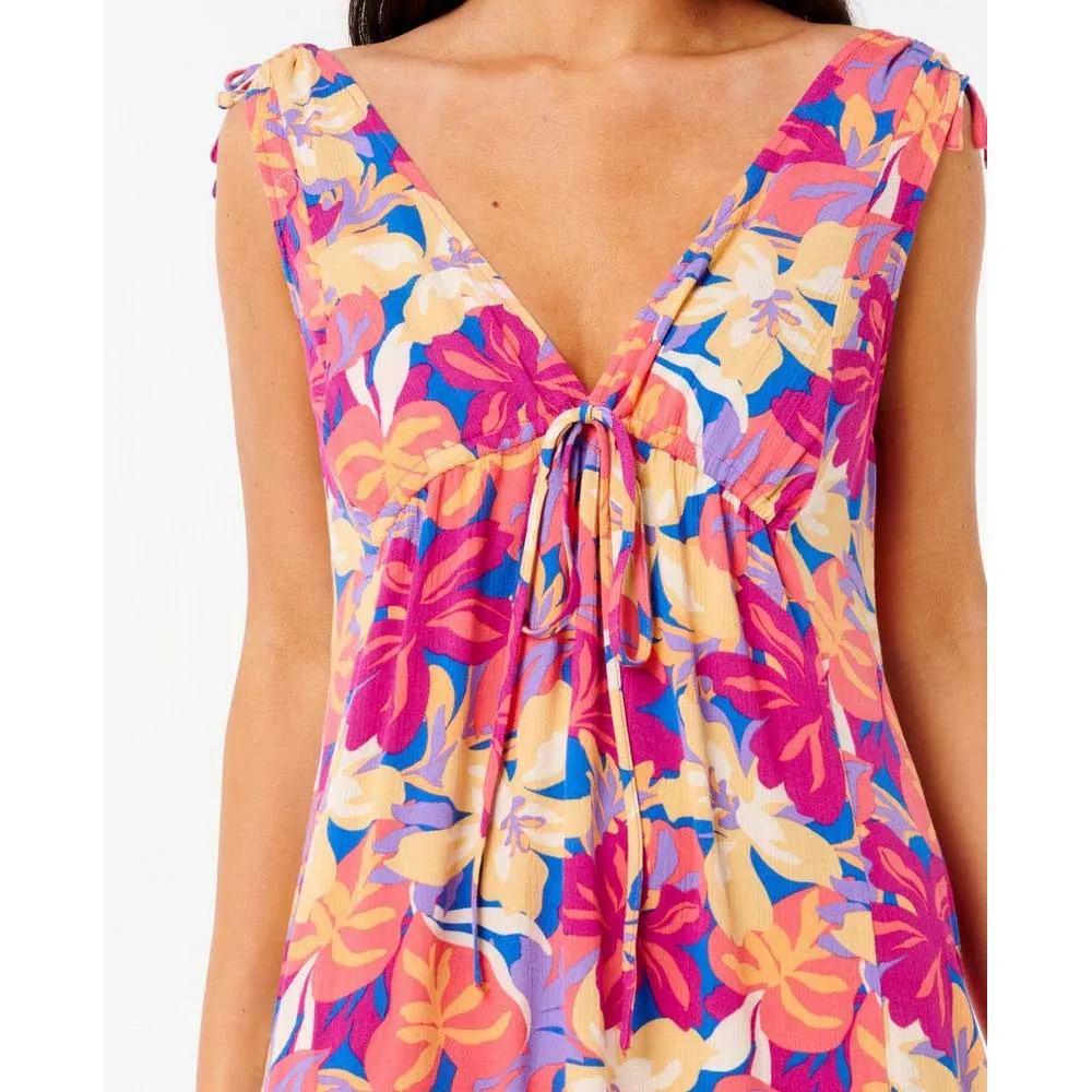 Легкое и воздушное, это пляжное платье с ярким тропическим принтом, глубоким V-образным вырезом и регулируемой завязкой идеально подходит для непринужденного пляжного или уличного стиля.