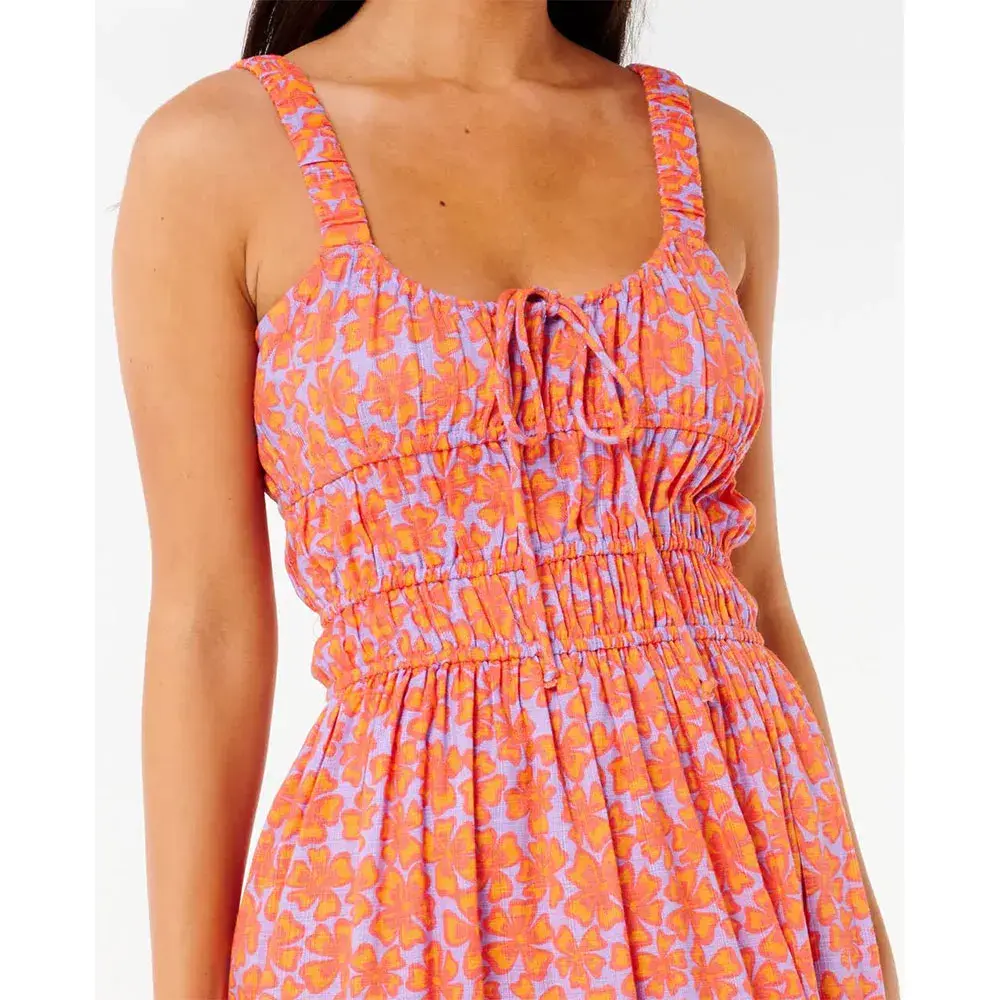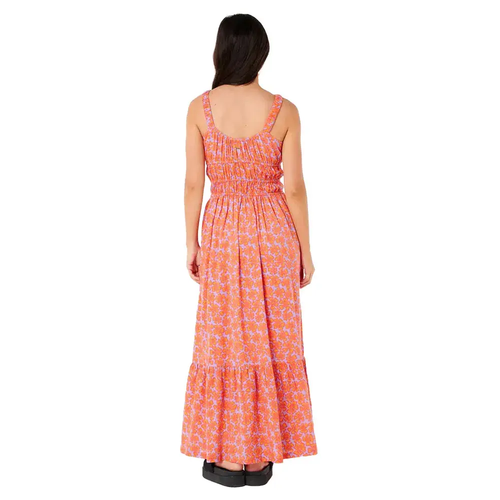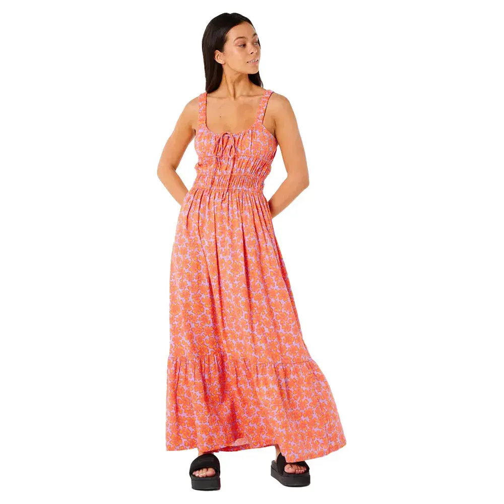 Это струящееся макси-платье с присборенным лифом, подчеркивающим фигуру, регулируемыми бретельками и многоярусной юбкой с нежным цветочным узором идеально подойдет для летних дней или повседневных прогулок.