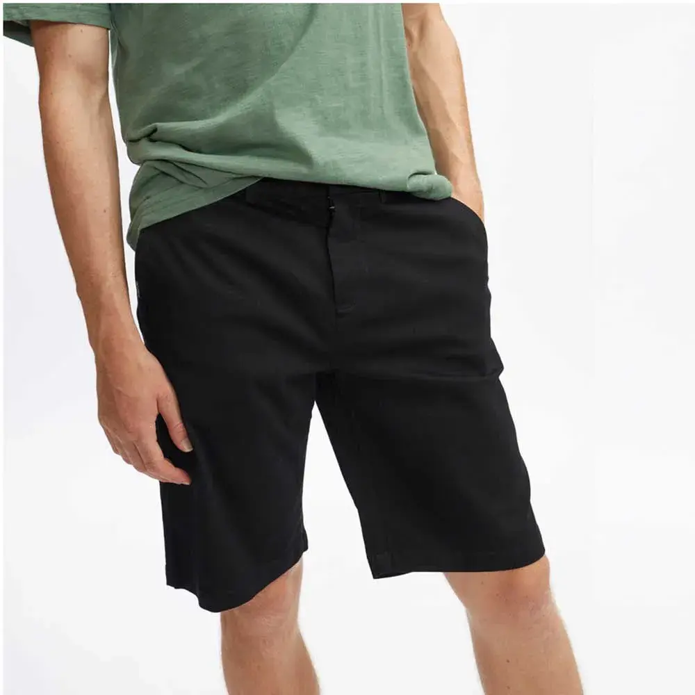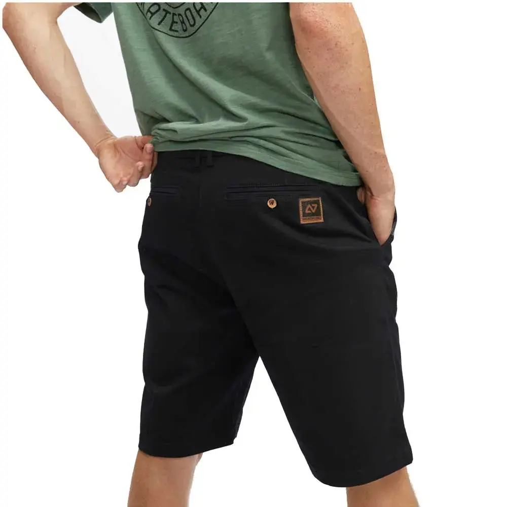 Укороченные брюки-чиносы с эластичной потертостью, стандартного кроя, с низкой талией и длиной до колена. Закрепки и тройная строчка усиливают зоны, наиболее подверженные износу при катании на скейтборде. Потайная застежка на молнию и пуговицы, косые передние карманы и прорезные задние карманы на пуговицах.