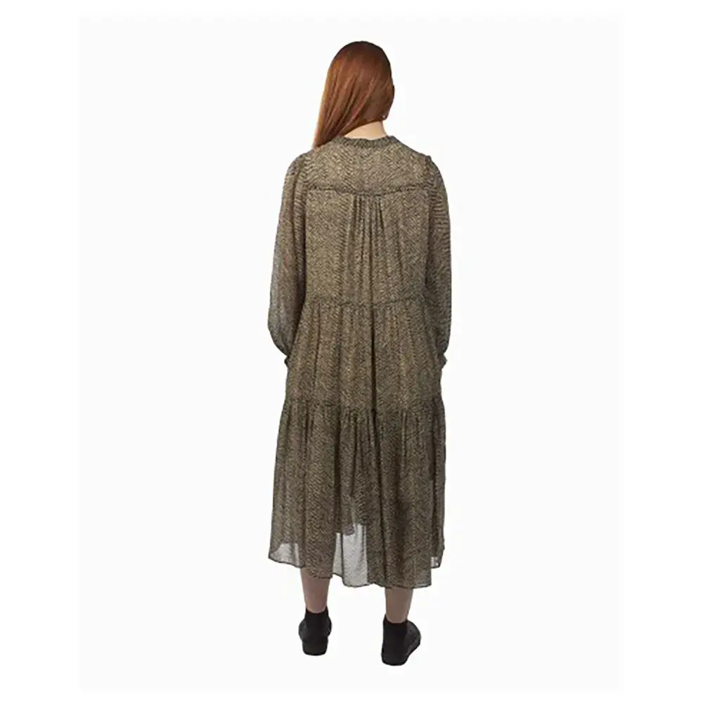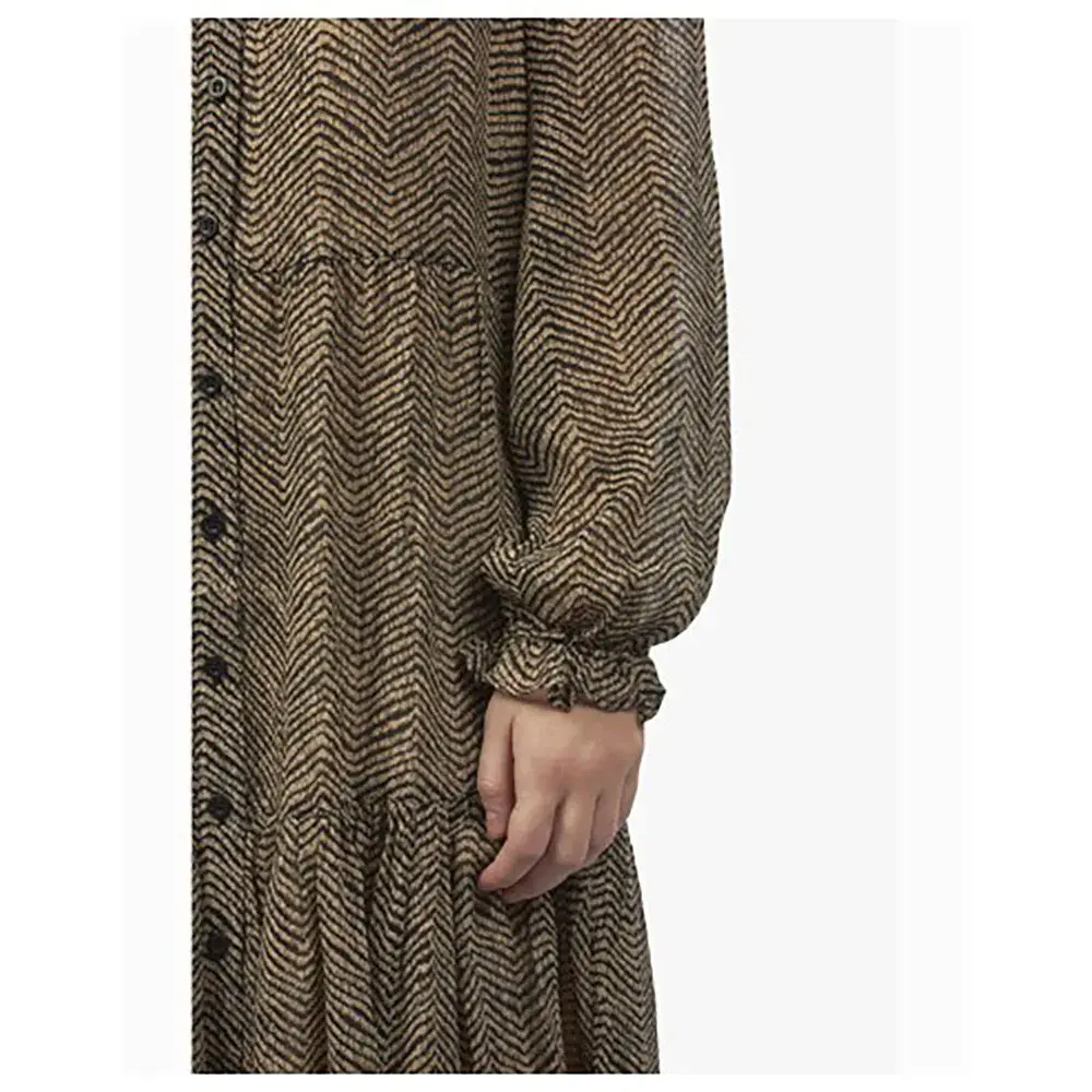 Платье Severine может похвастаться тщательно продуманным дизайном, который подчеркивает различные типы фигуры. Его длина миди достигает универсально выгодной точки ниже колена, удлиняя ноги и создавая изящный силуэт. Длинные рукава обеспечивают дополнительное тепло и защиту, что делает его идеальным для прохладных дней или смены сезонов. Анималистичный принт, вневременной и привлекающий внимание узор, добавляет нотку индивидуальности и стиля, гарантируя, что вы выделитесь из толпы.