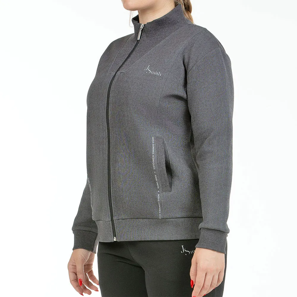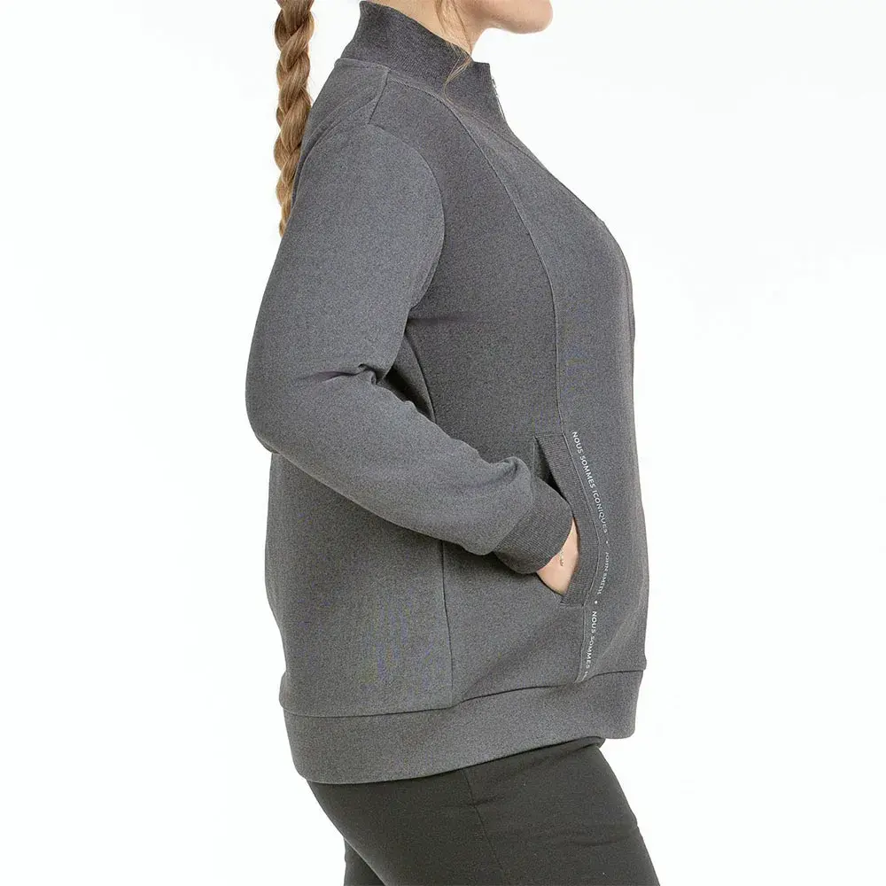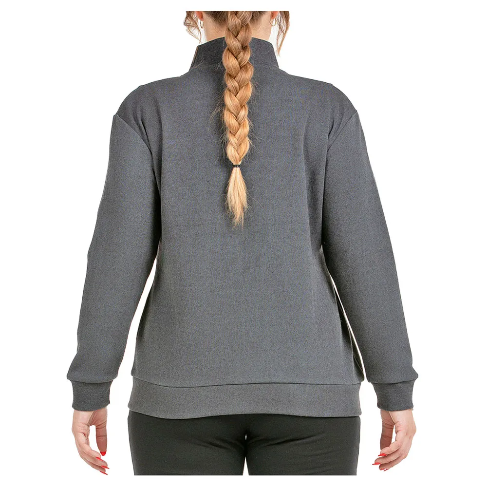Свитшот имеет центральную застежку-молнию, водолазку и ребристые манжеты, боковые швы, которые делают силуэт женственнее, и боковые карманы с ребристыми деталями.