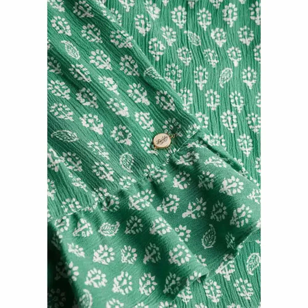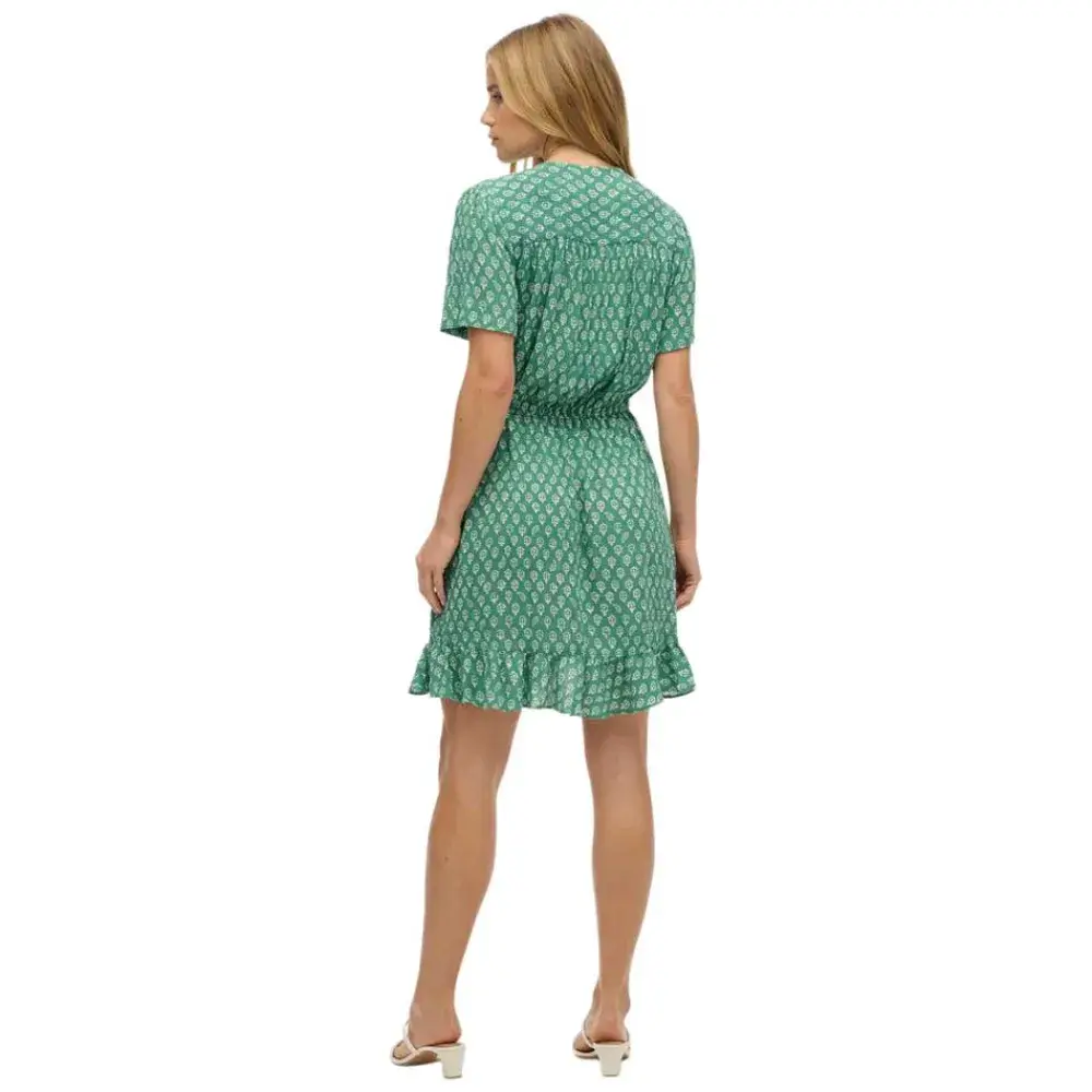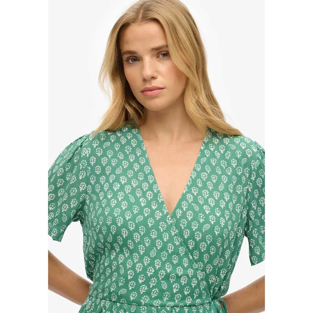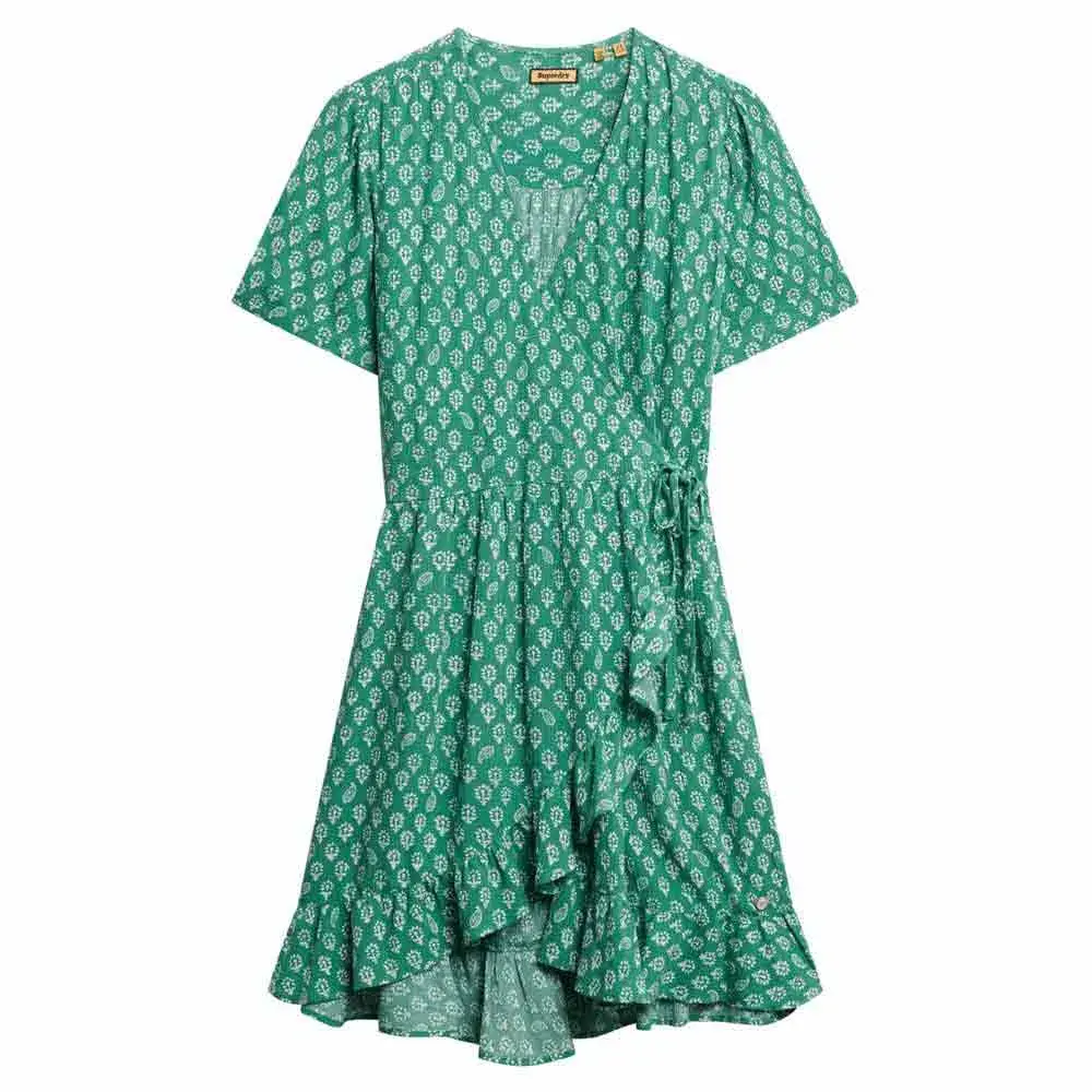 Мини-платье-обертка с принтом и короткими рукавами, оборчатым подолом и тканым материалом — идеальный выбор для летних мероприятий и отпуска.