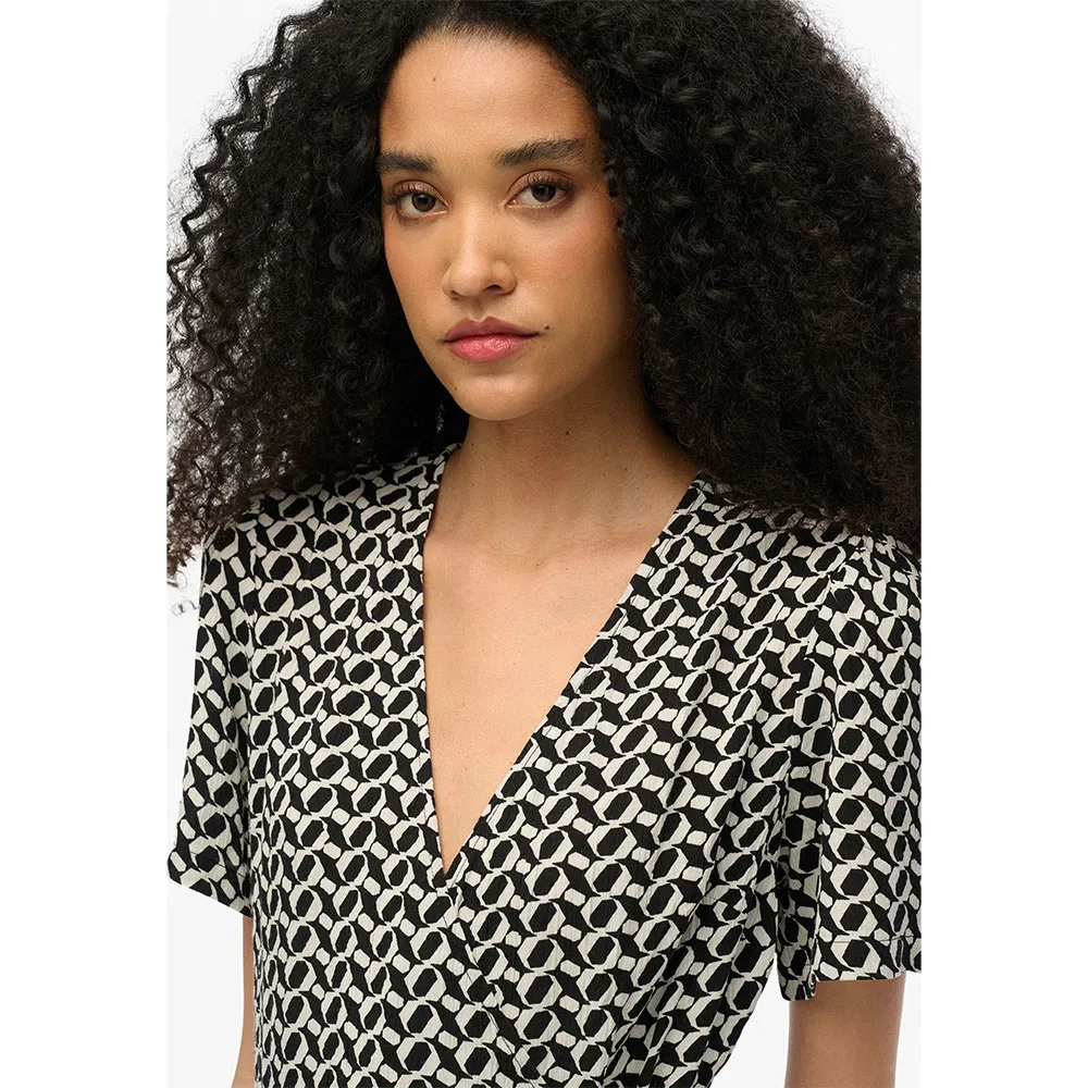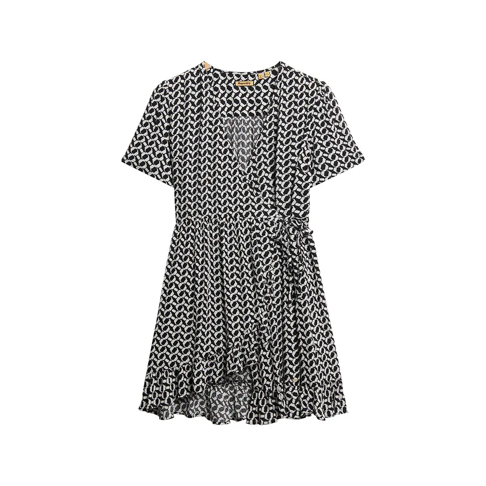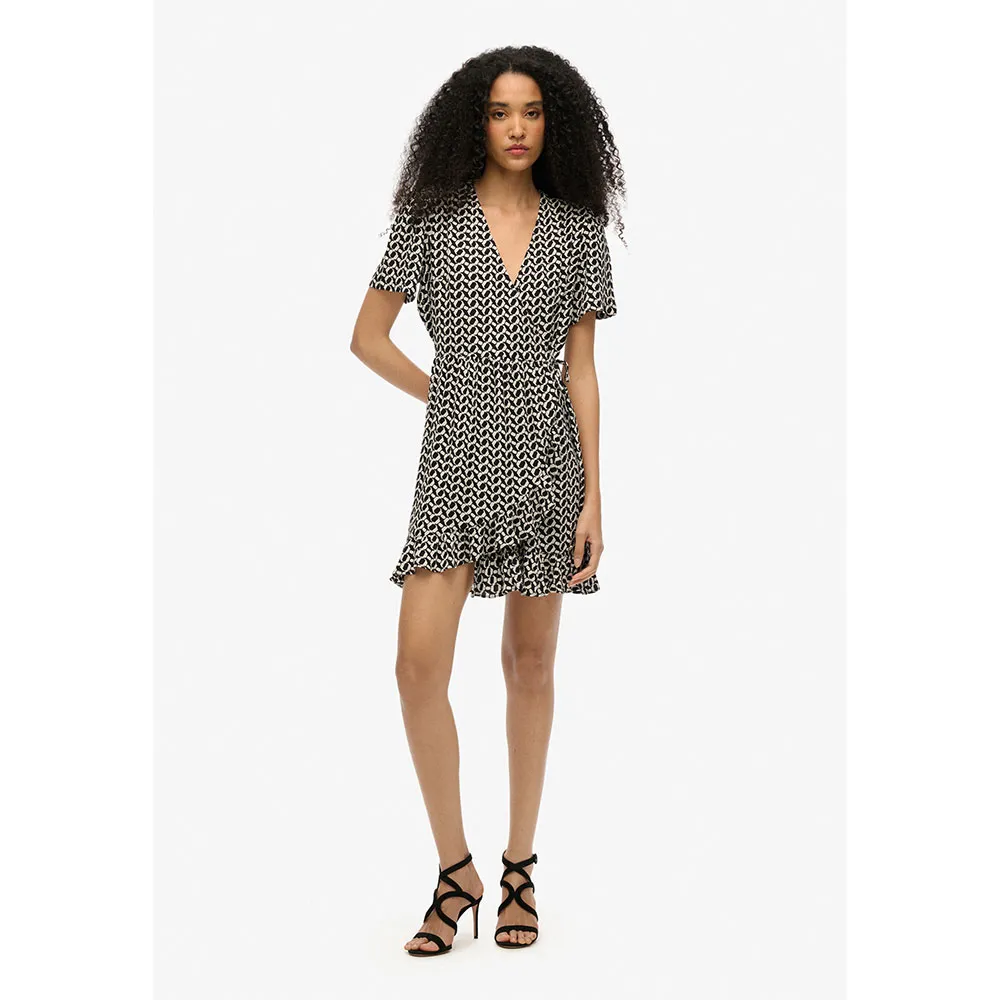 Мини-платье-обертка с принтом и короткими рукавами, оборчатым подолом и тканым материалом — идеальный выбор для летних мероприятий и отпуска.